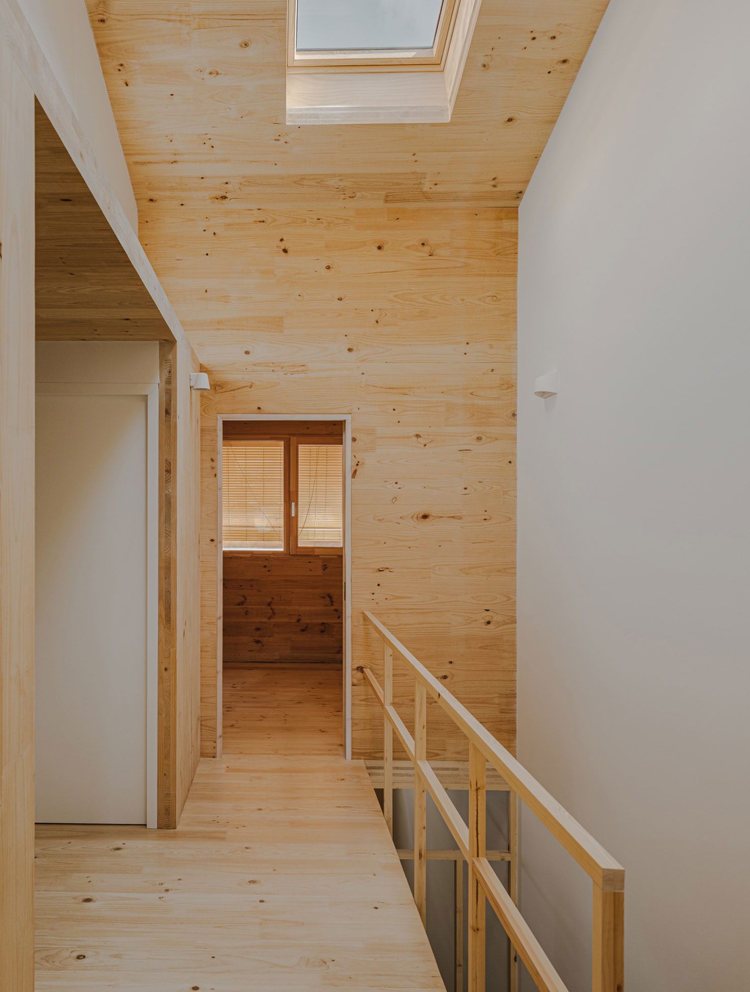 The structure responds directly to the layout of the house. The entire first floor is conceived as a closed box of cross-laminated timber (CLT), resting on the existing party walls. The two ground-floor roof sections are built with timber beams and slats, spanning between the timber box and the ground-floor façades. The street façade is restored, recovering the original appearance of the house.