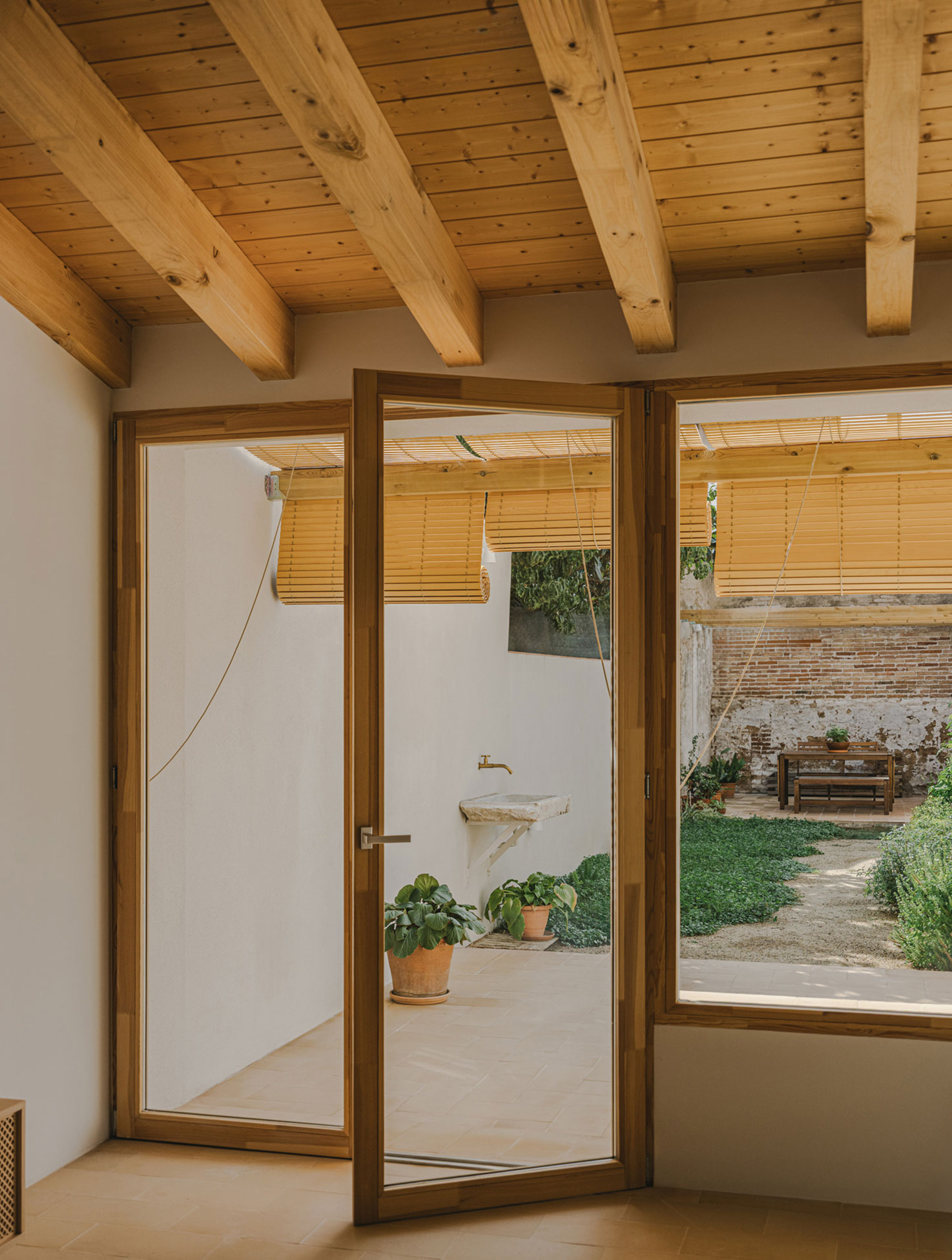 The decision to dispense with mechanical heating and cooling relies on a highly optimised envelope and the use of bioclimatic strategies. In summer, cross ventilation is reinforced by roof windows that enhance the stack effect, cooling the house at night. During the day, traditional shutters protect from direct sunlight and ceiling fans add comfort. In the courtyard, a pergola and vegetation provide shade and help reduce the heat island effect. In winter, every ray of sunlight is captured and warmth is retained thanks to effective insulation.