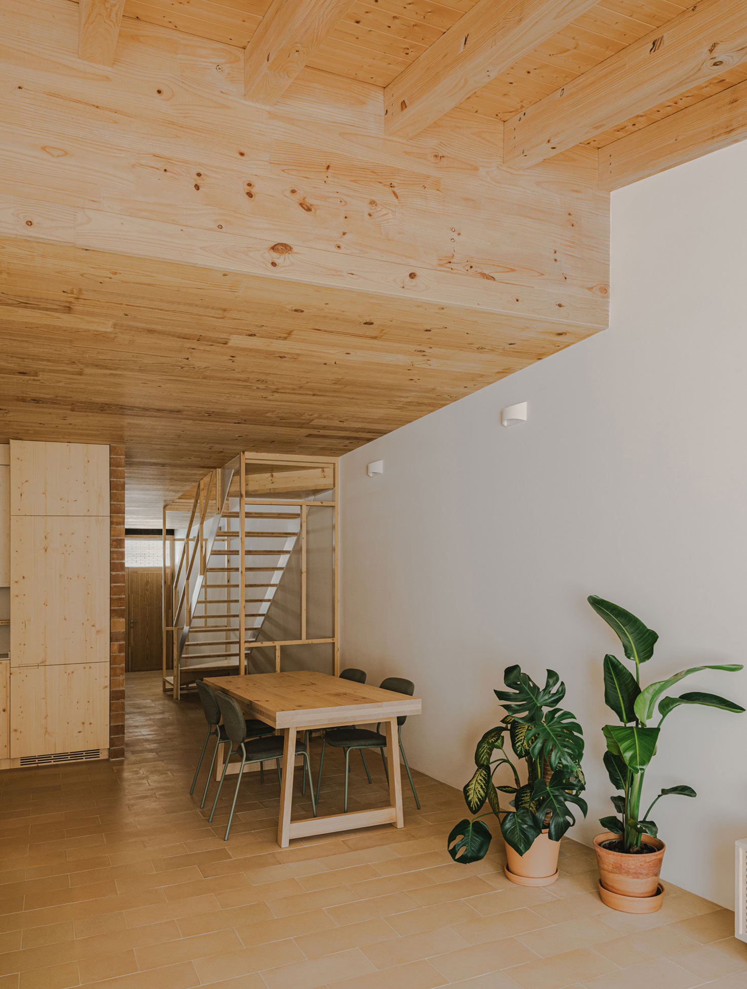 False ceilings and unnecessary finishes were deliberately avoided, favouring natural and sustainable materials. The structure, windows, shutters, furniture and doors are all made of wood. Insulation is provided by wood fibre, and the façades are clad with cork panels. Inside, the upper floor benefits from the warmth of exposed timber. On the ground floor, ceramic tiles from El Bruc and brickwork from El Segrià bring freshness, forming a carefully chosen palette that helps regulate temperature and humidity throughout the house.