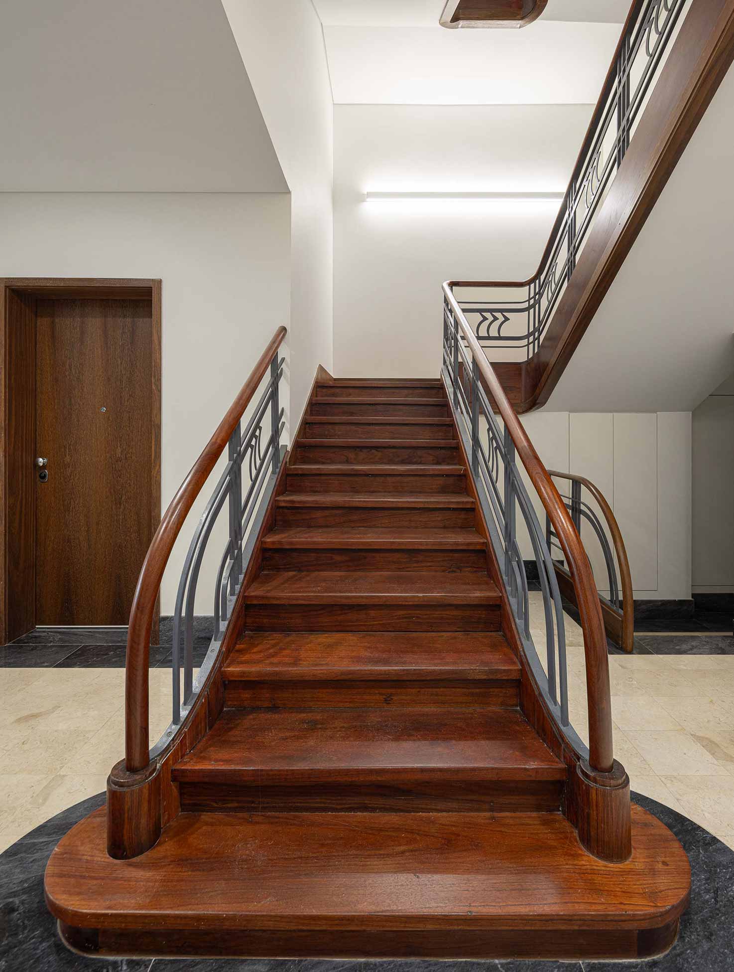 Inside, the most architecturally significant elements were also retained, namely the main atrium and the original staircase shaft, with its wooden and metal structure, which was likewise replicated in the additional floors to maintain the aesthetic and material coherence of the ensemble.