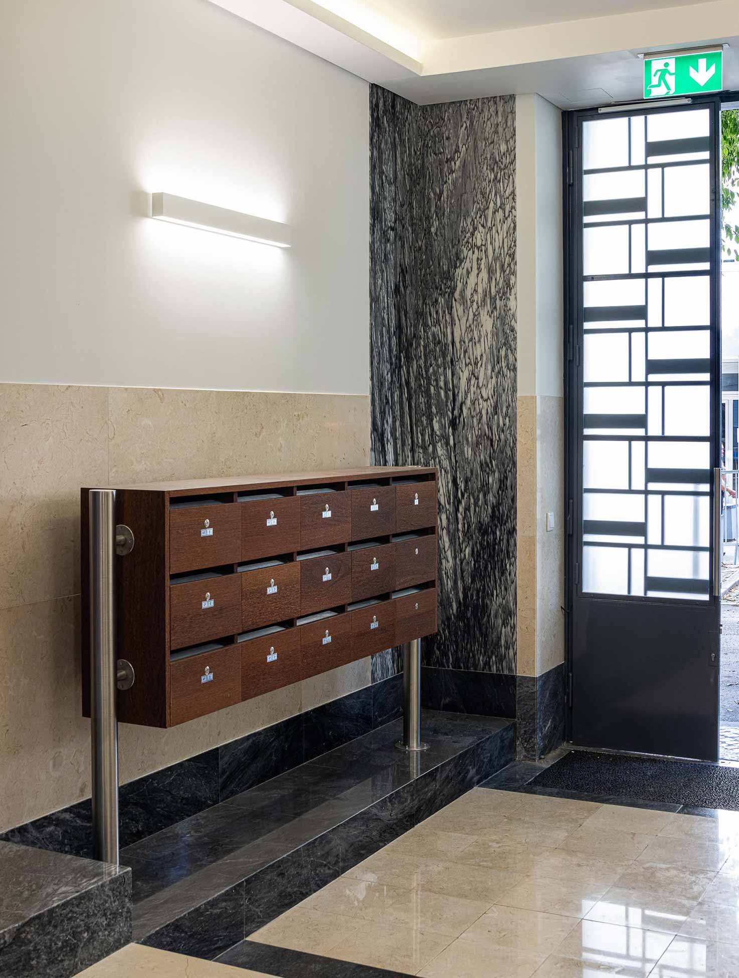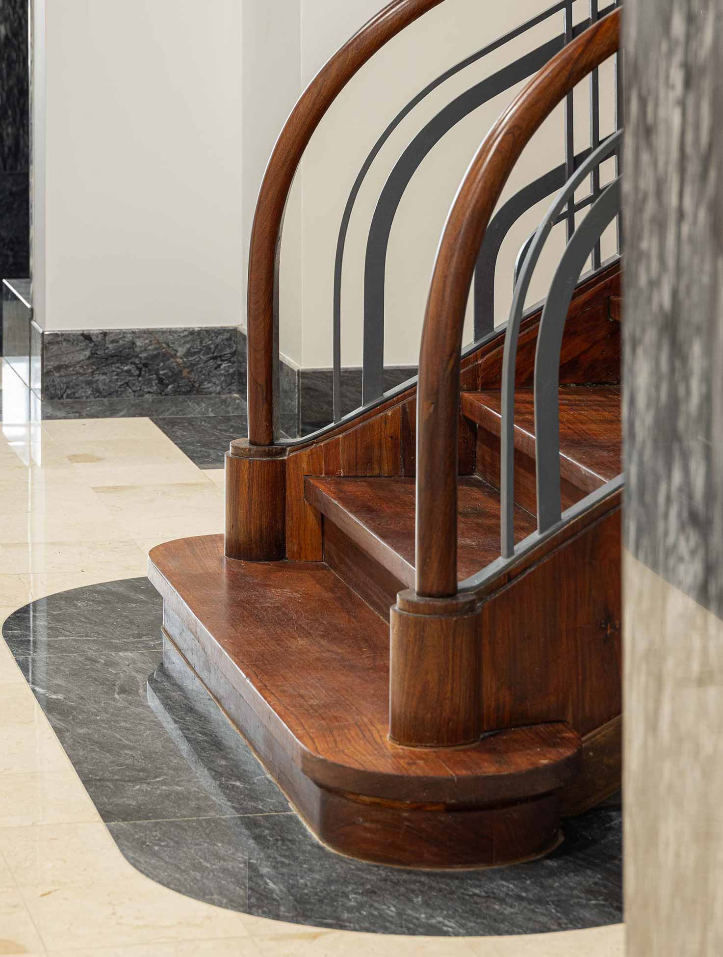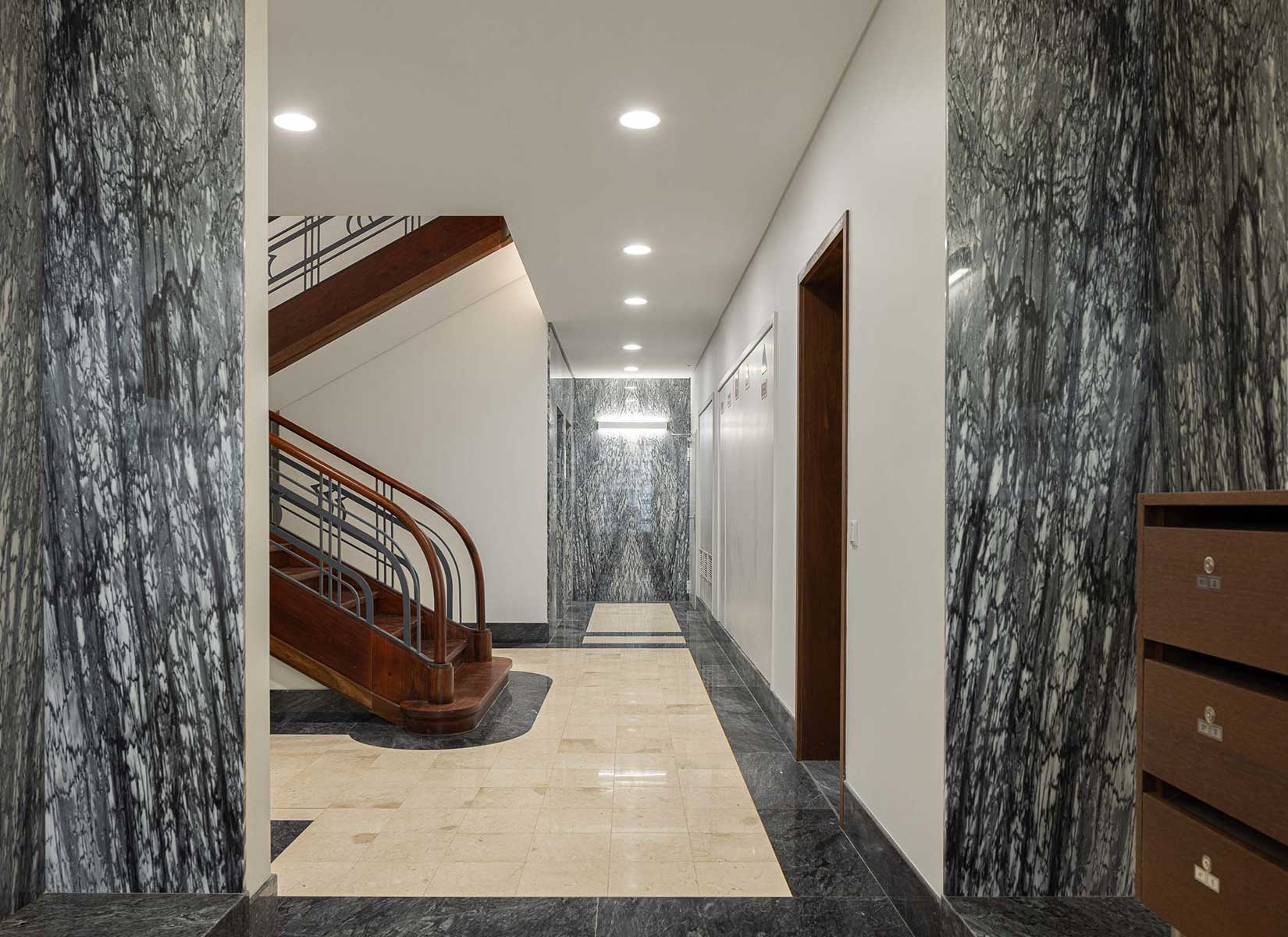 On the façade, the most emblematic architectural elements were preserved, such as the stone base, the building’s main entrance door, the stonework of the upper floors, and the sculptural bas-reliefs. The preservation and replication of these elements in the new floors were essential to ensuring the continuity of the building’s essence and historical character.