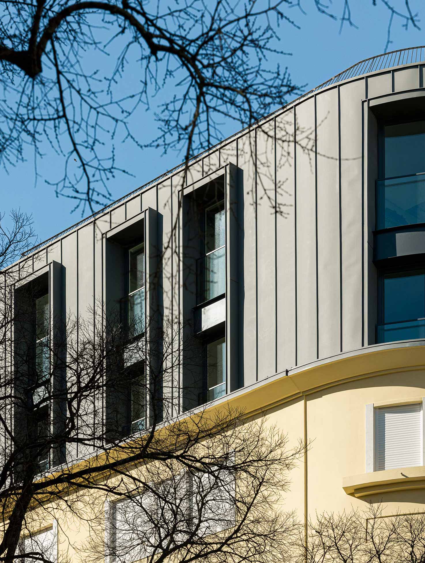 The two additional upper floors, while maintaining the formal continuity of the ensemble, adopt a more sober and distinct architectural language. To achieve this, a new zinc volume was created, slightly set back from the façade plane, which not only “completes” the building but also enhances the harmony of its composition.