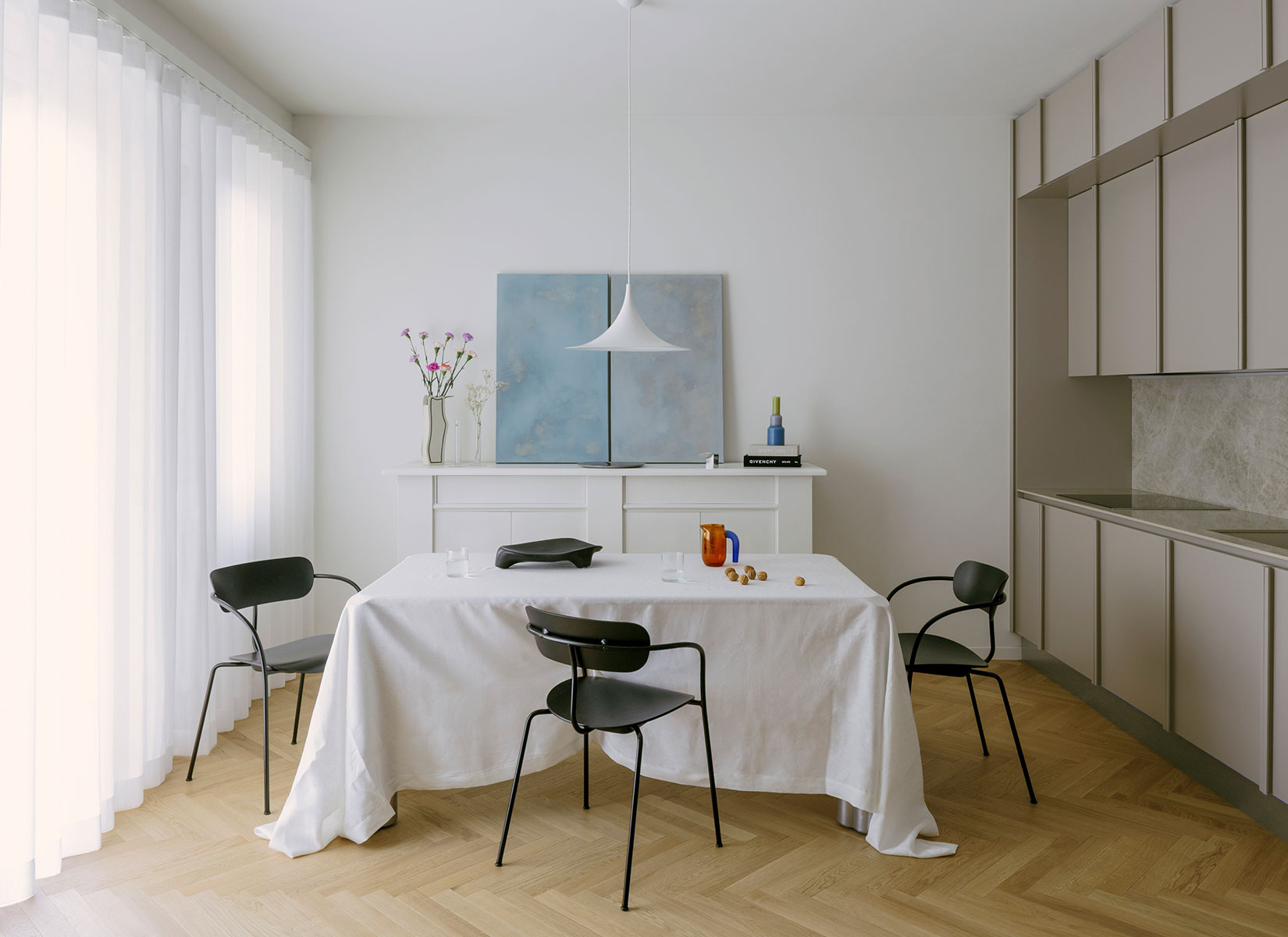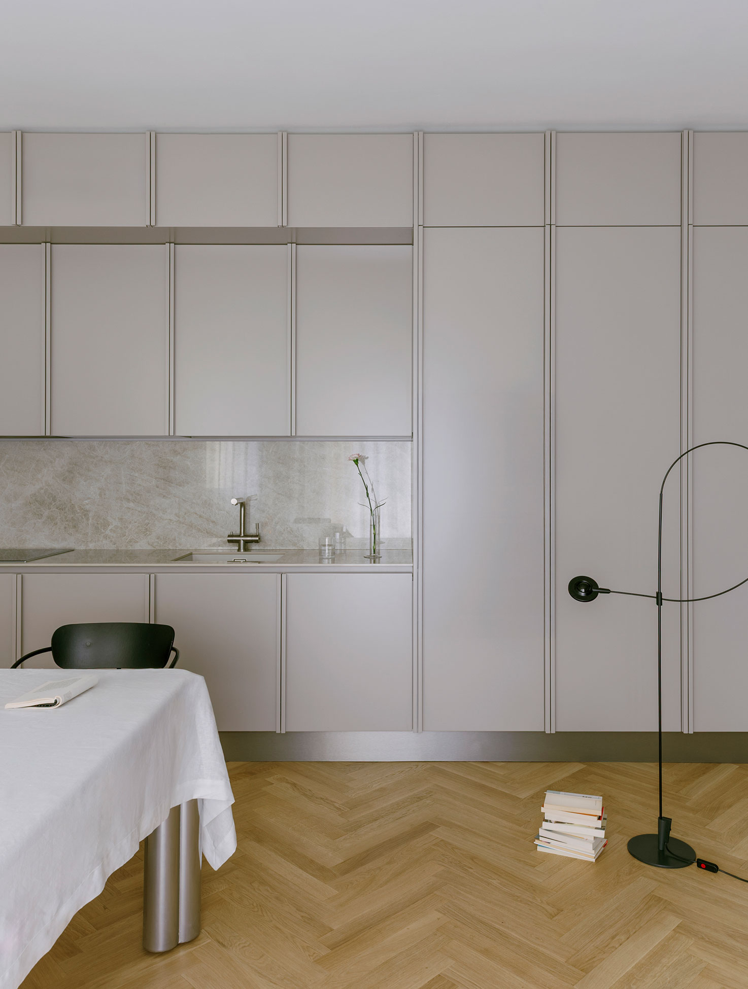 The custom-made terrazzo countertops recall Milanese tradition, anchoring the project in the memory of local materials.