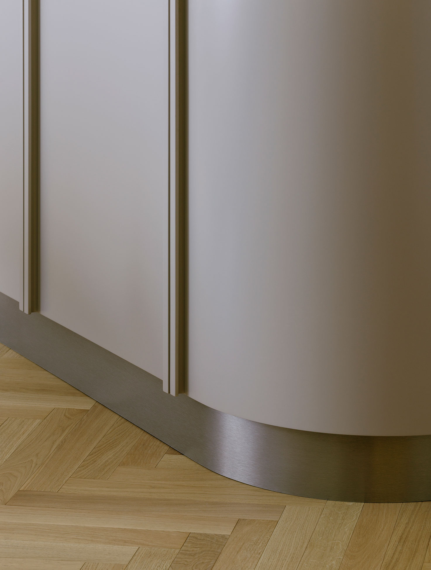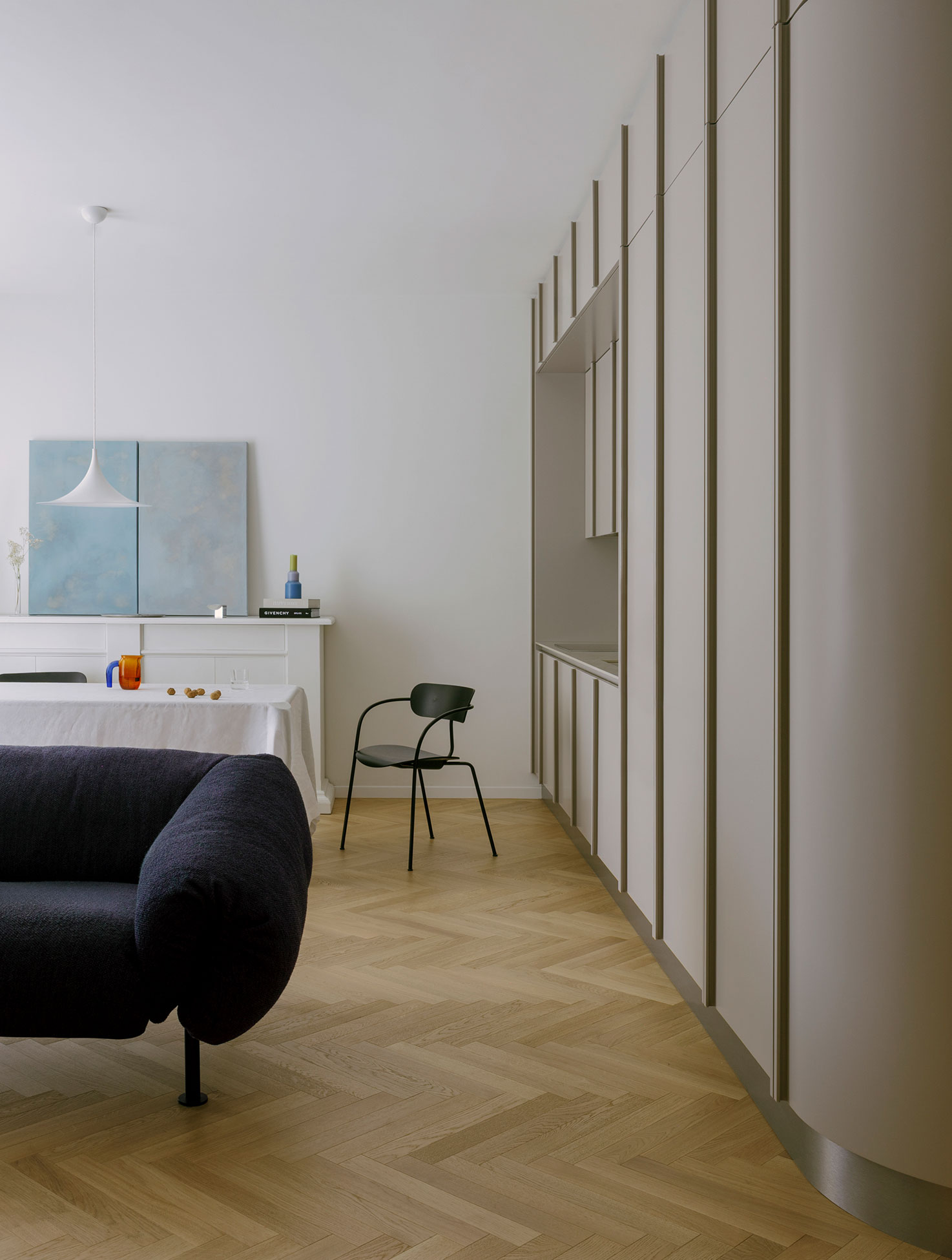 The plaster geometries of the pre-existing boiserie have been reinterpreted in a contemporary key on the wall unit’s panels, giving the project a sense of unity and identity.