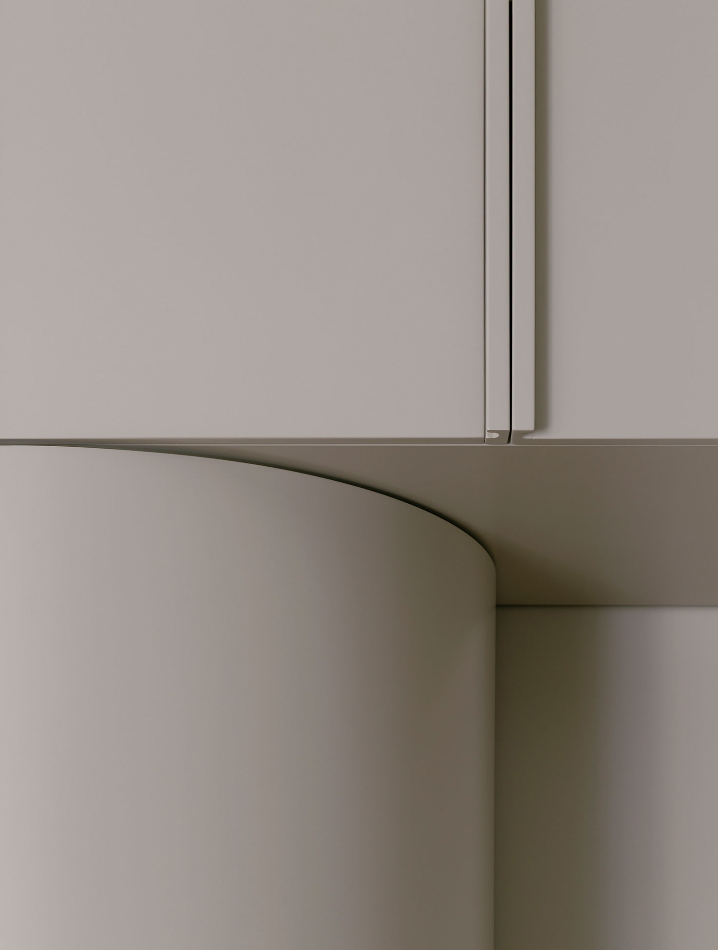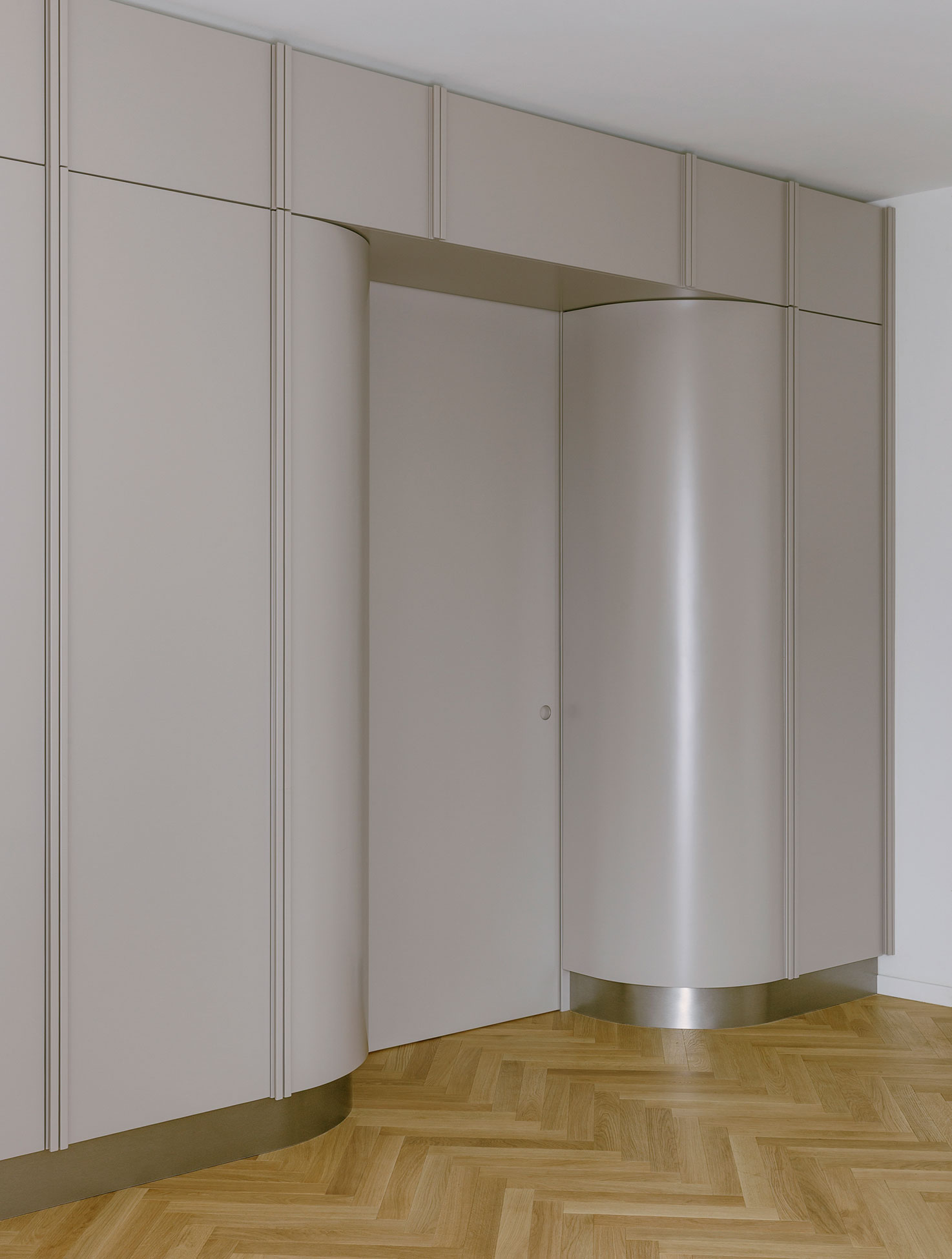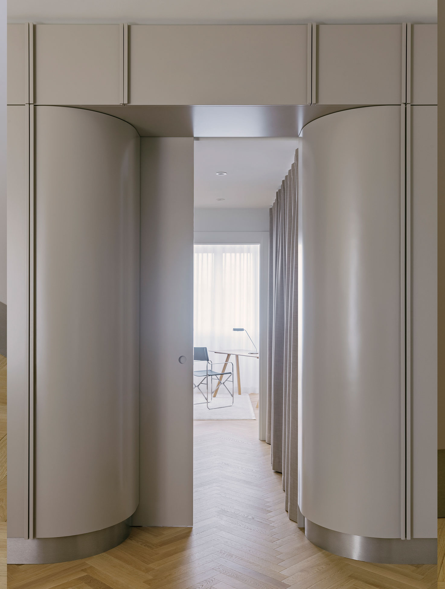 Access to the sleeping area is provided by a concealed sliding door integrated into the wall unit, highlighted by two beveled panels that mark the passage and gently lead toward the more intimate part of the house.