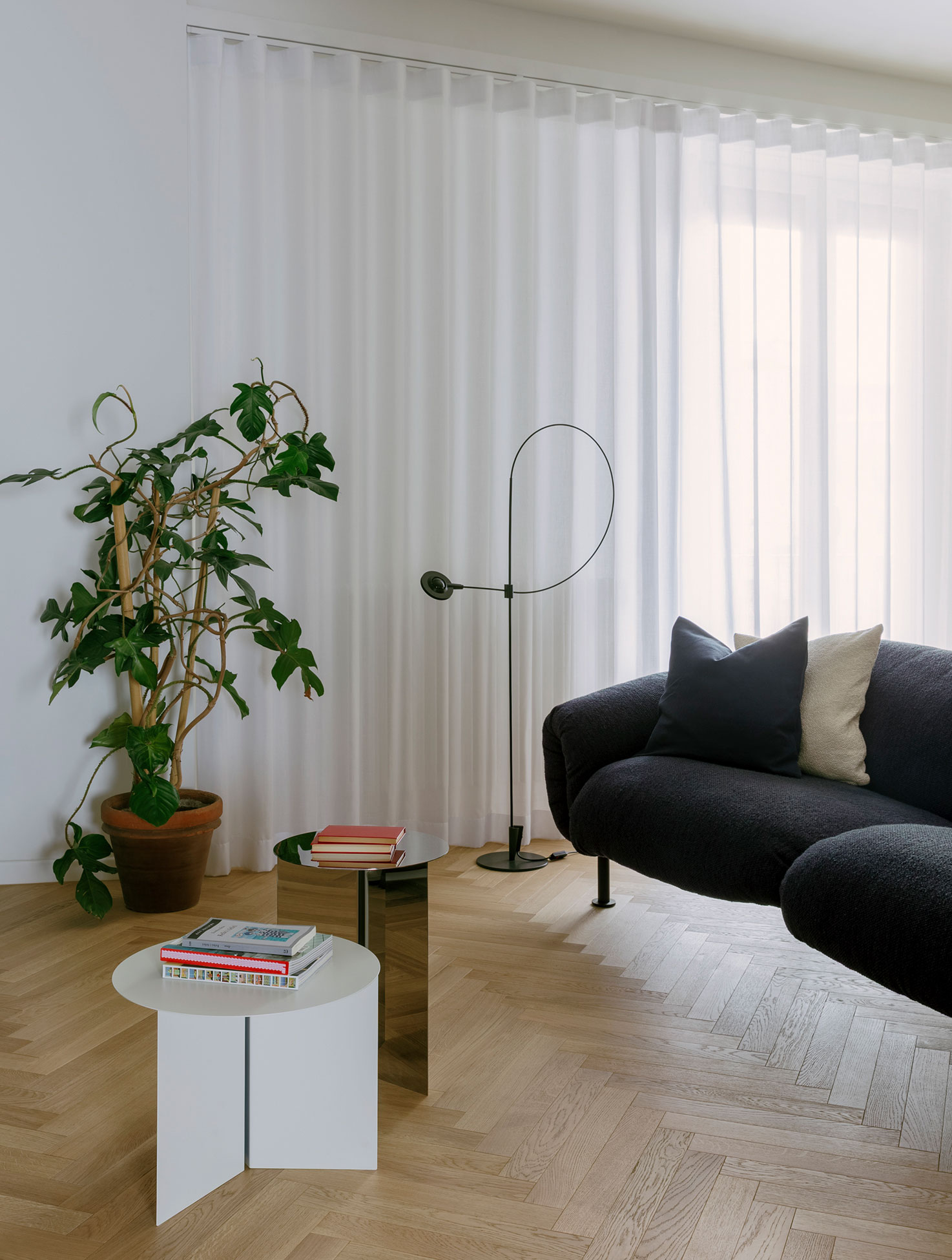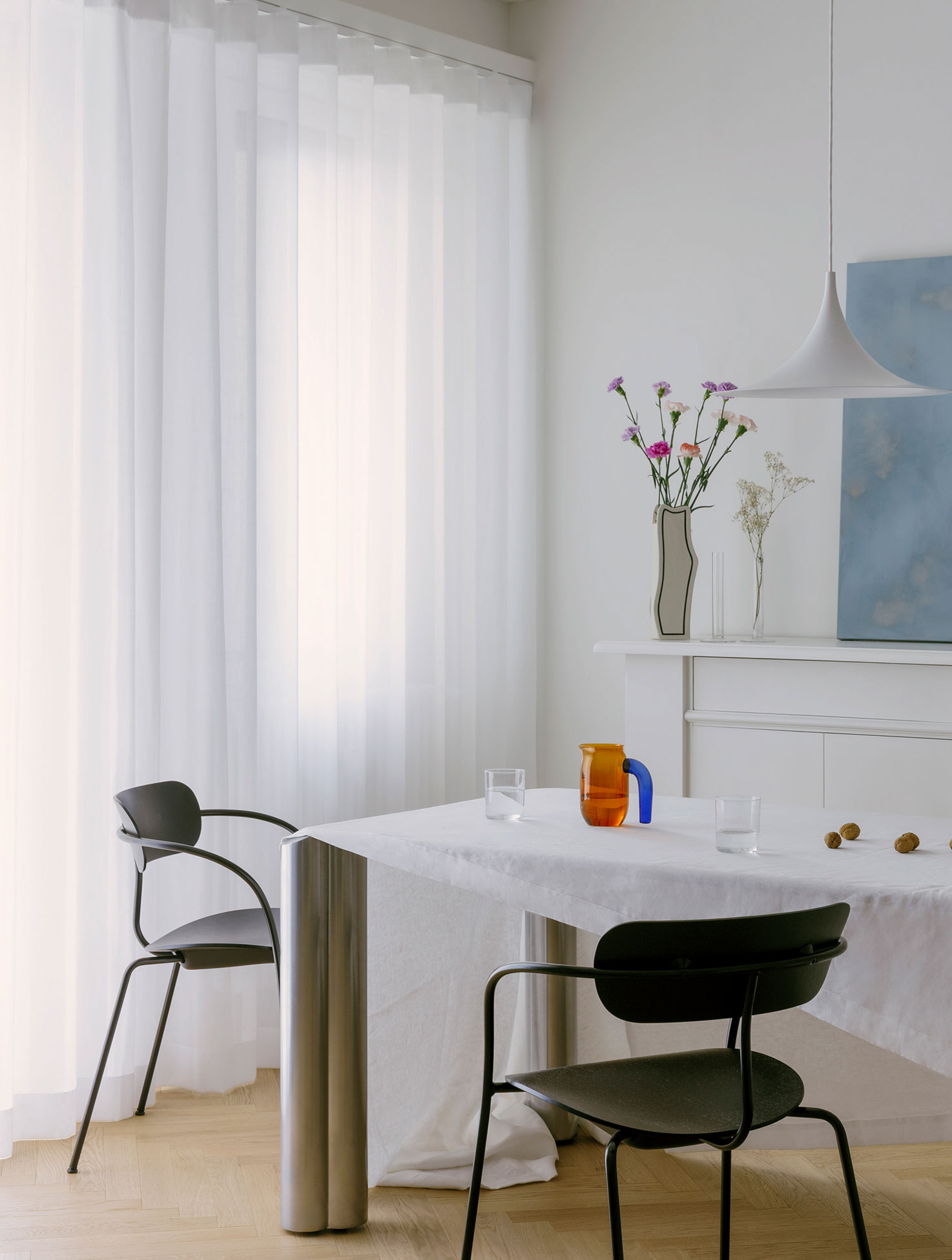 The addition of a plasterboard ceiling not only fulfills a technical function but also introduces a sense of spatial compression that, by contrast, enhances the perceived width and brightness of the main rooms.