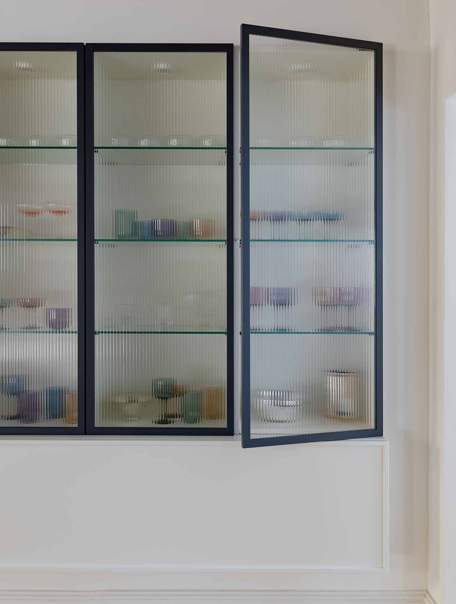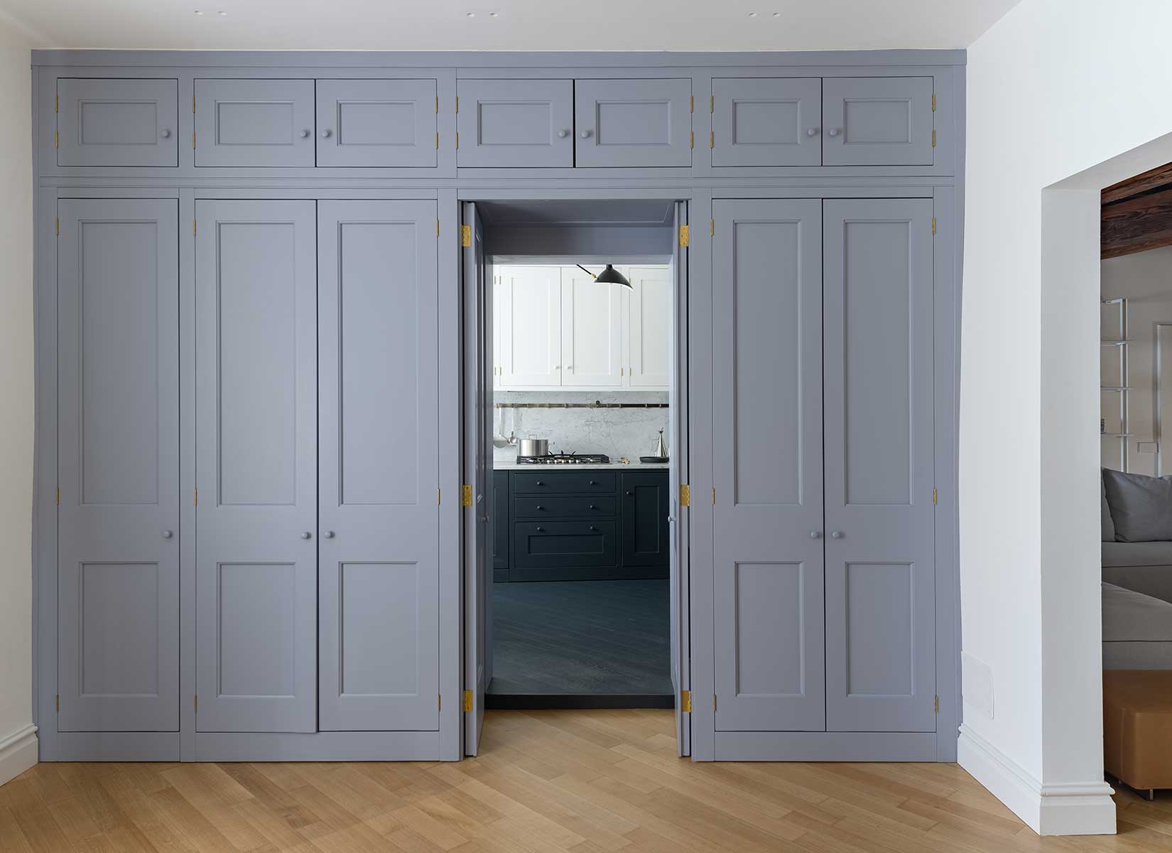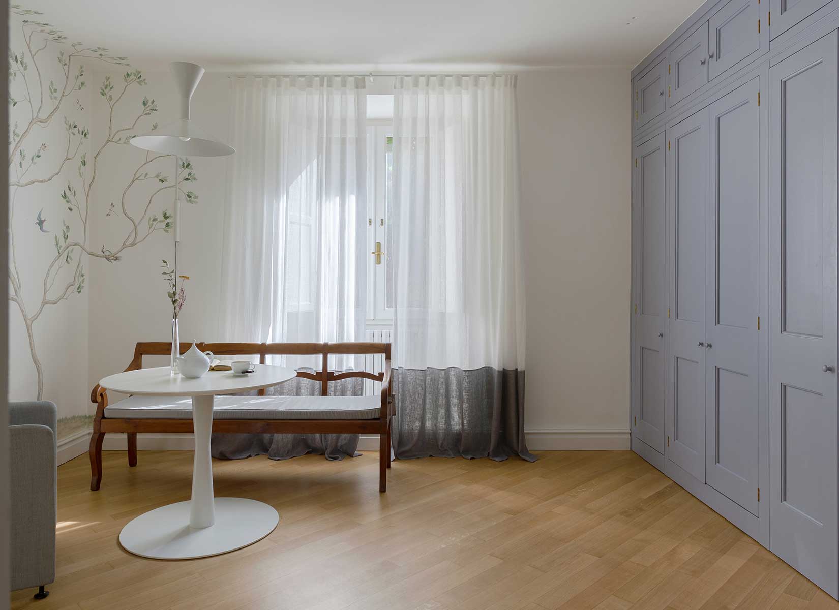 The custom-designed boiserie and wardrobes integrate seamlessly into the walls, where the “sugar paper” blue becomes the focal point. This tone elegantly complements the Baroque bed upholstered in Rubelli blue fabric and the classically styled bathroom, achieving a perfect balance between past and present. The entire project reveals a refined dialogue between historical and contemporary elements, restoring to the apartment a unique atmosphere that reflects the personality and vision of the designers, without ever compromising on artisanal quality and tradition.
