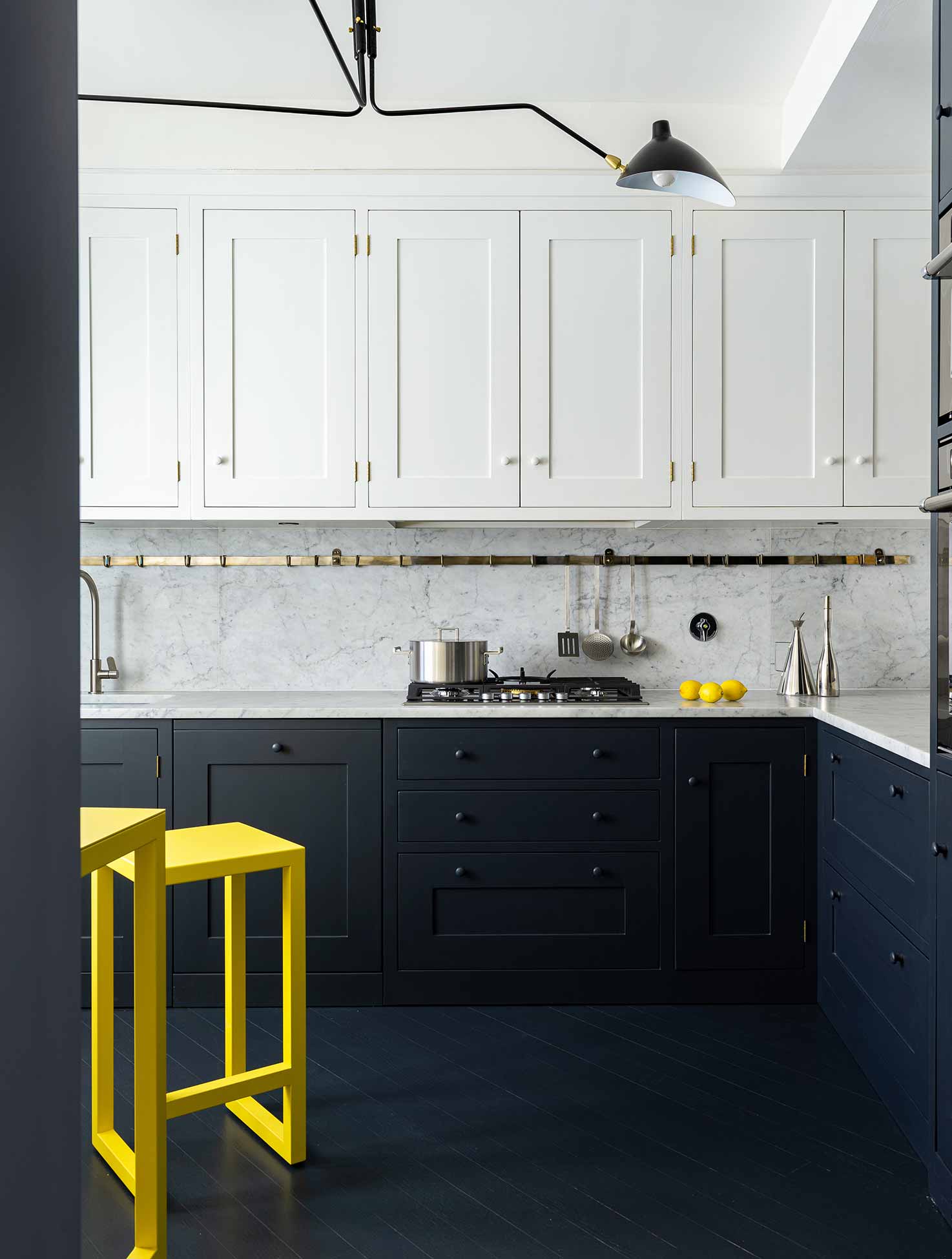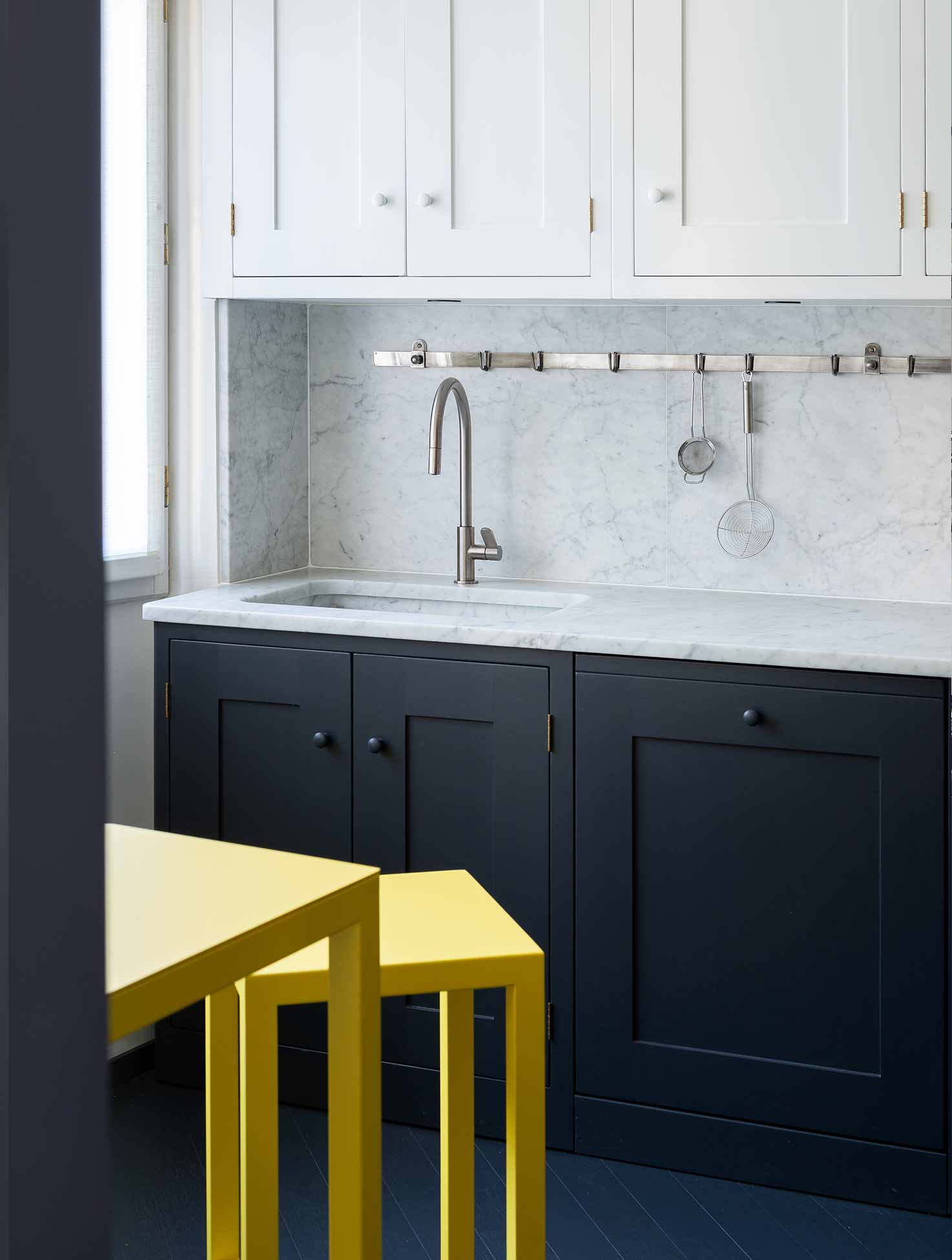 Opposite, a custom-designed bookcase by the architects elegantly separates the entrance from the kitchen. The kitchen, featuring a chromatic continuity with the flooring, is enlivened by the vibrant yellow of the table and stools, creating a dynamic contrast. It was designed by Andrea and Margherita and crafted by the artisans of Homewood.