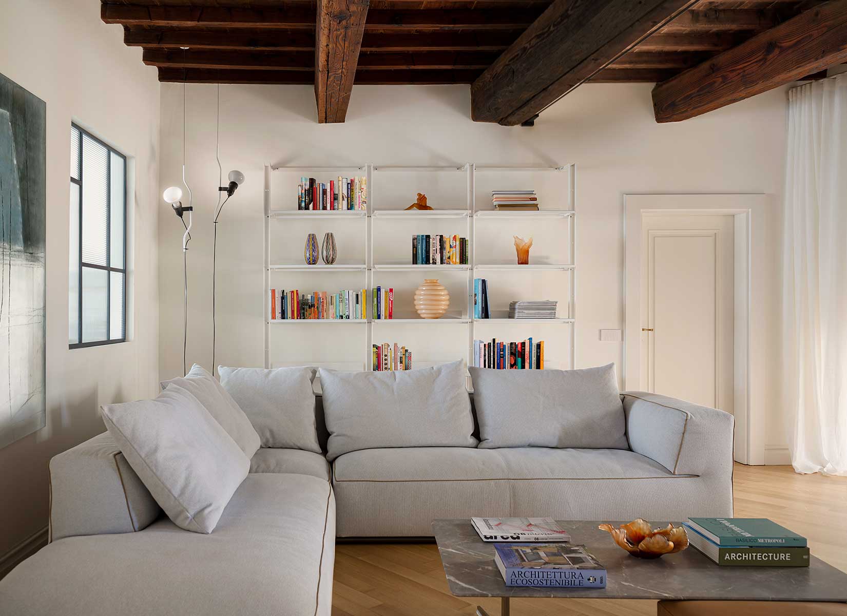 A distinctive element of the kitchen is the fixed, opaque glass panel, which acts as a visual filter between this area and the living room, providing a discreet yet effective separation. The living room itself is characterized by classic boiserie-wardrobes, also designed by the architects and crafted by Homewood, which harmoniously blend with the contemporary Flexform sofa, the iconic table by Fiam, and antique chairs. Completing the space is an open bookcase by DeSalto and warm lighting, composed of Flos fixtures and the “Infinito” suspension light by Davide Groppi, which is subtly integrated among the wooden beams, adding a touch of modernity without compromising the historical harmony of the space. The sleeping area is distinguished by the use of two complementary tones: a delicate pink for the children’s room and “sugar paper” blue for the master bedroom.