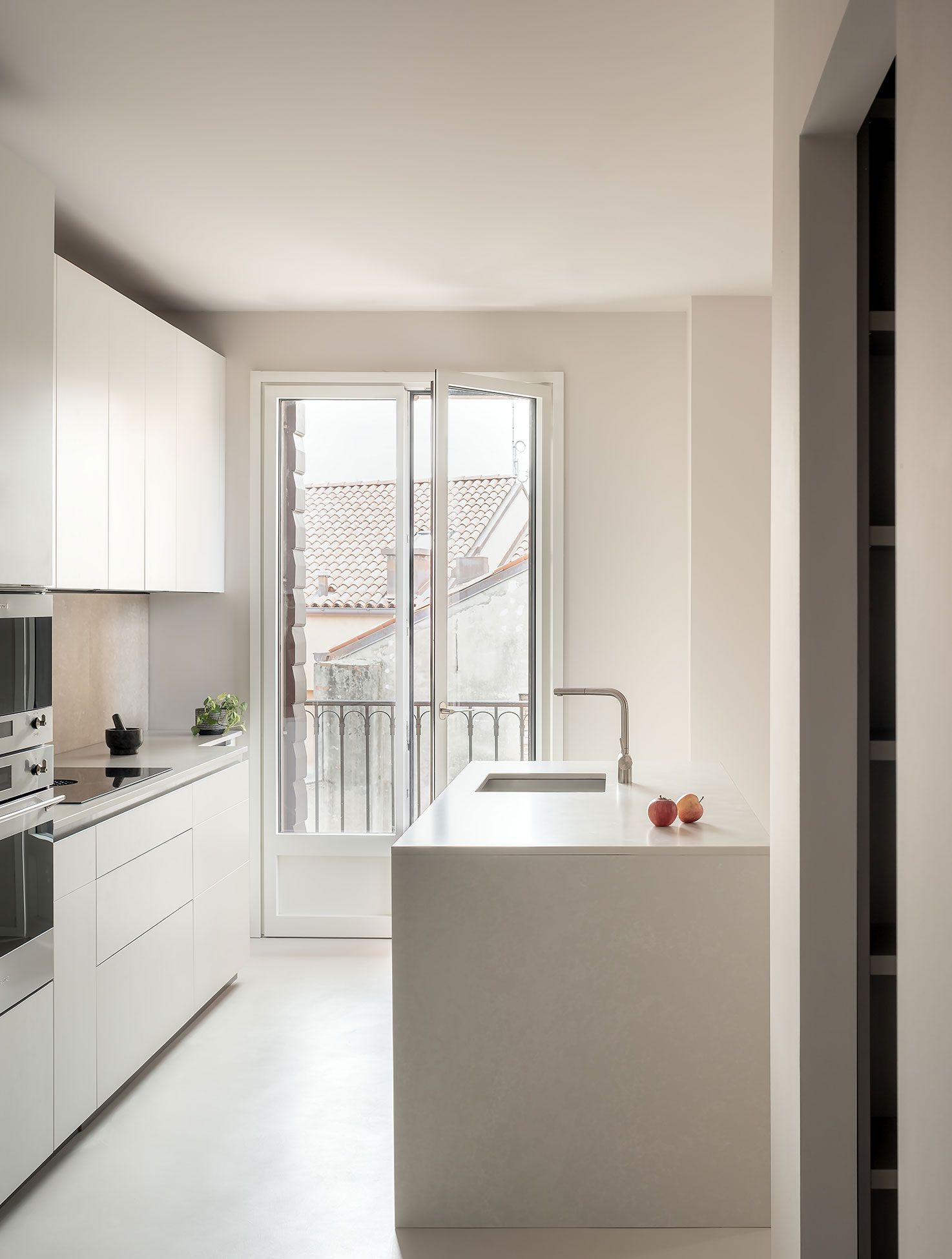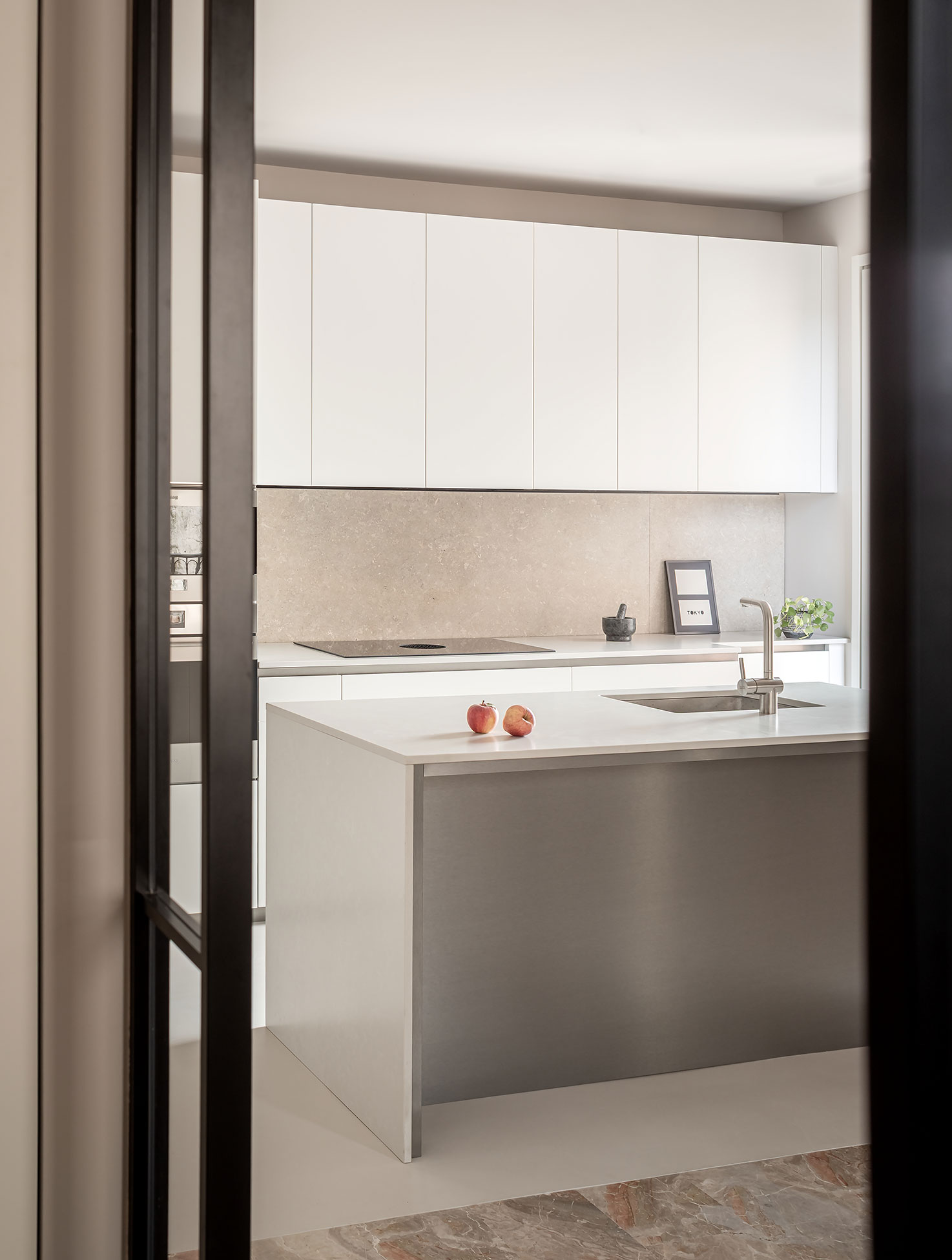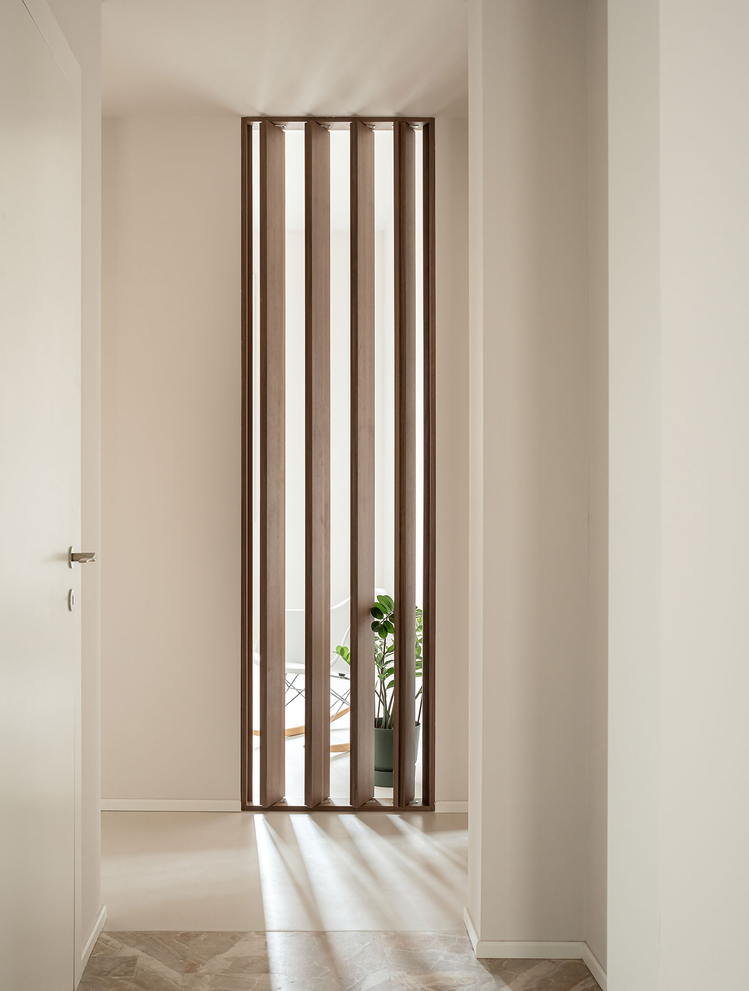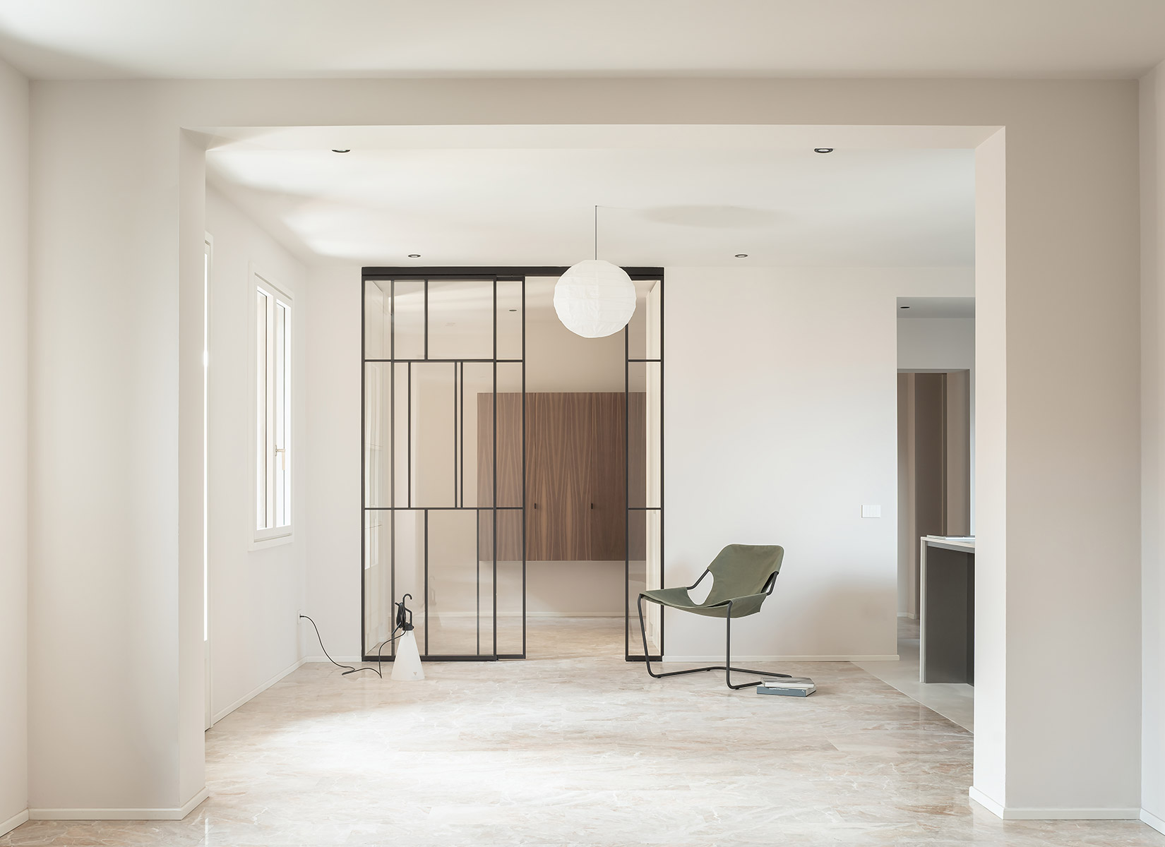 By restoring the existing marble and wooden floorings and introducing new surfaces in Grigio Alpi Vicenza stone -together with custom walnut wood furniture- the design establishes a dialogue between existing and newly added materials. Particular attention was given to natural light and air circulation, which were enhanced through the selective removal of partitions and the careful placement of bespoke furniture elements. These interventions allow light and air to flow freely through the spaces, creating a bright, open, and harmonious living environment. Together with the whole furniture, the project turns out as a vibrant space.