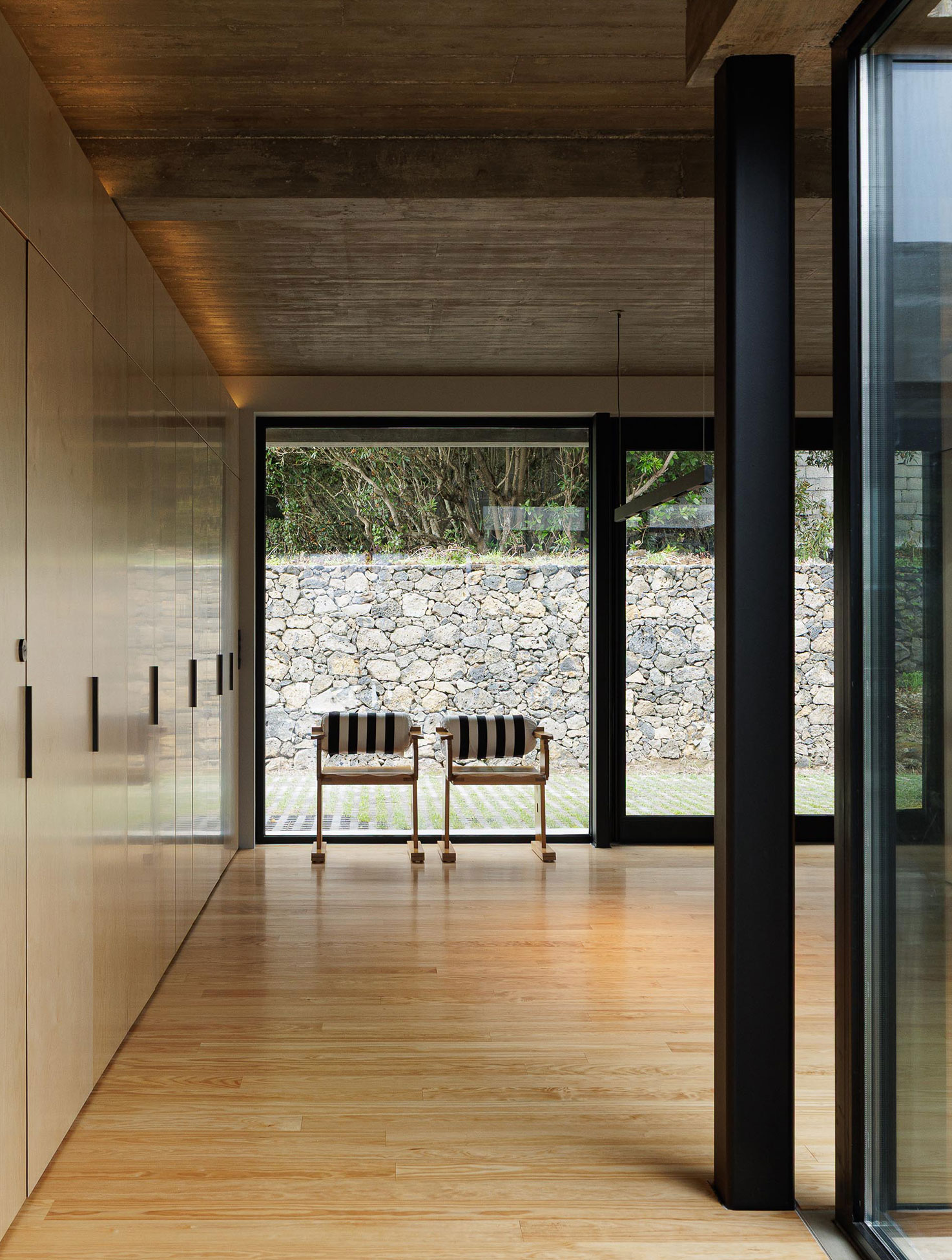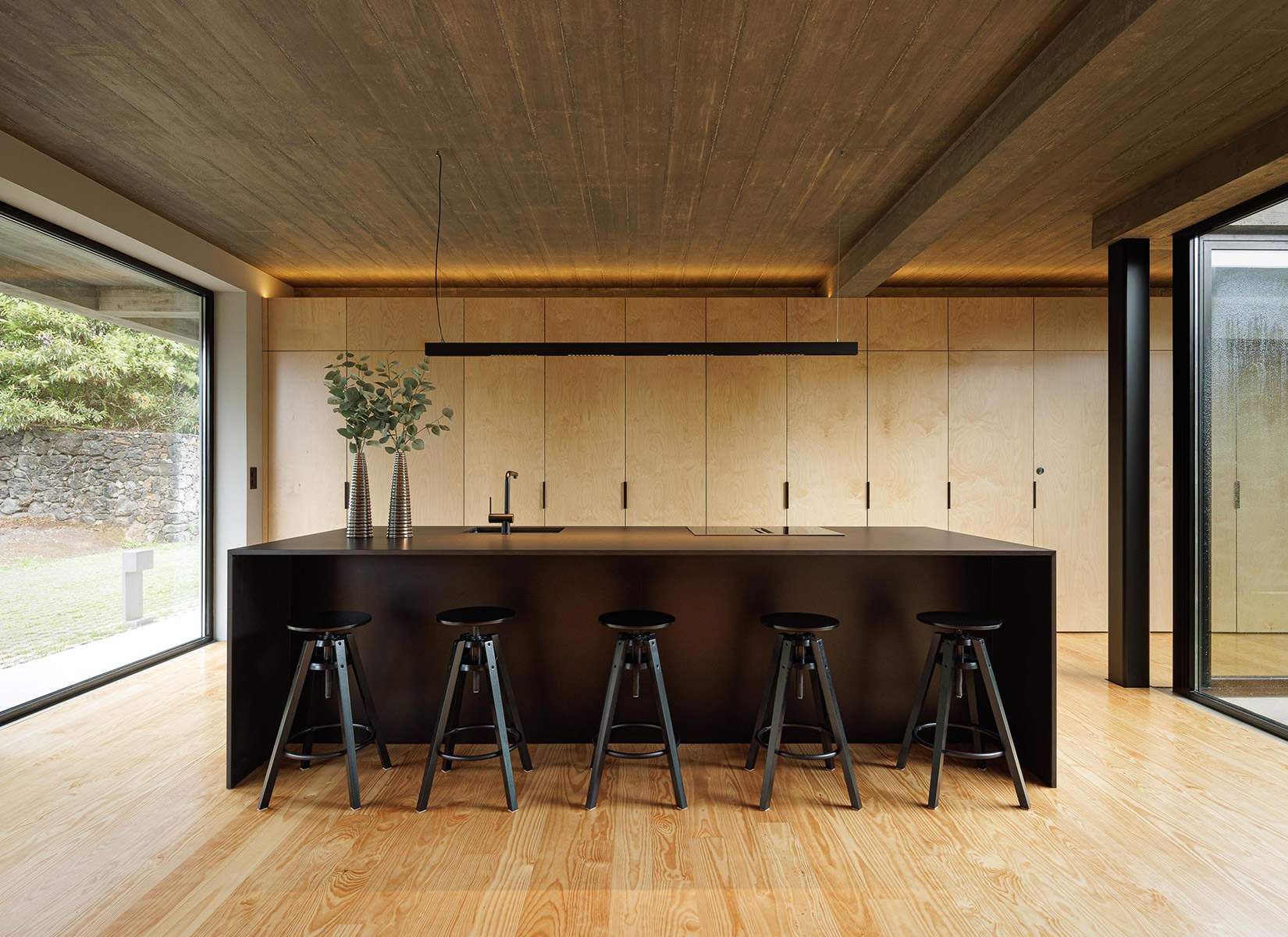 The interiors are lined with wood, warming the atmosphere and reinforcing the presence of natural elements in daily life. Everything is clear, accessible, and continuous. From any point in the house, one can see the exterior, the courtyard, and the horizon.