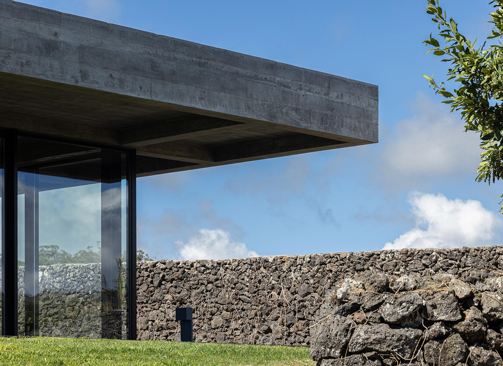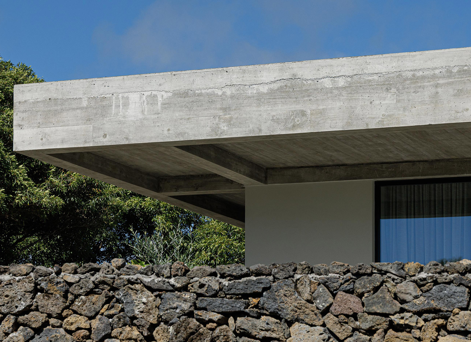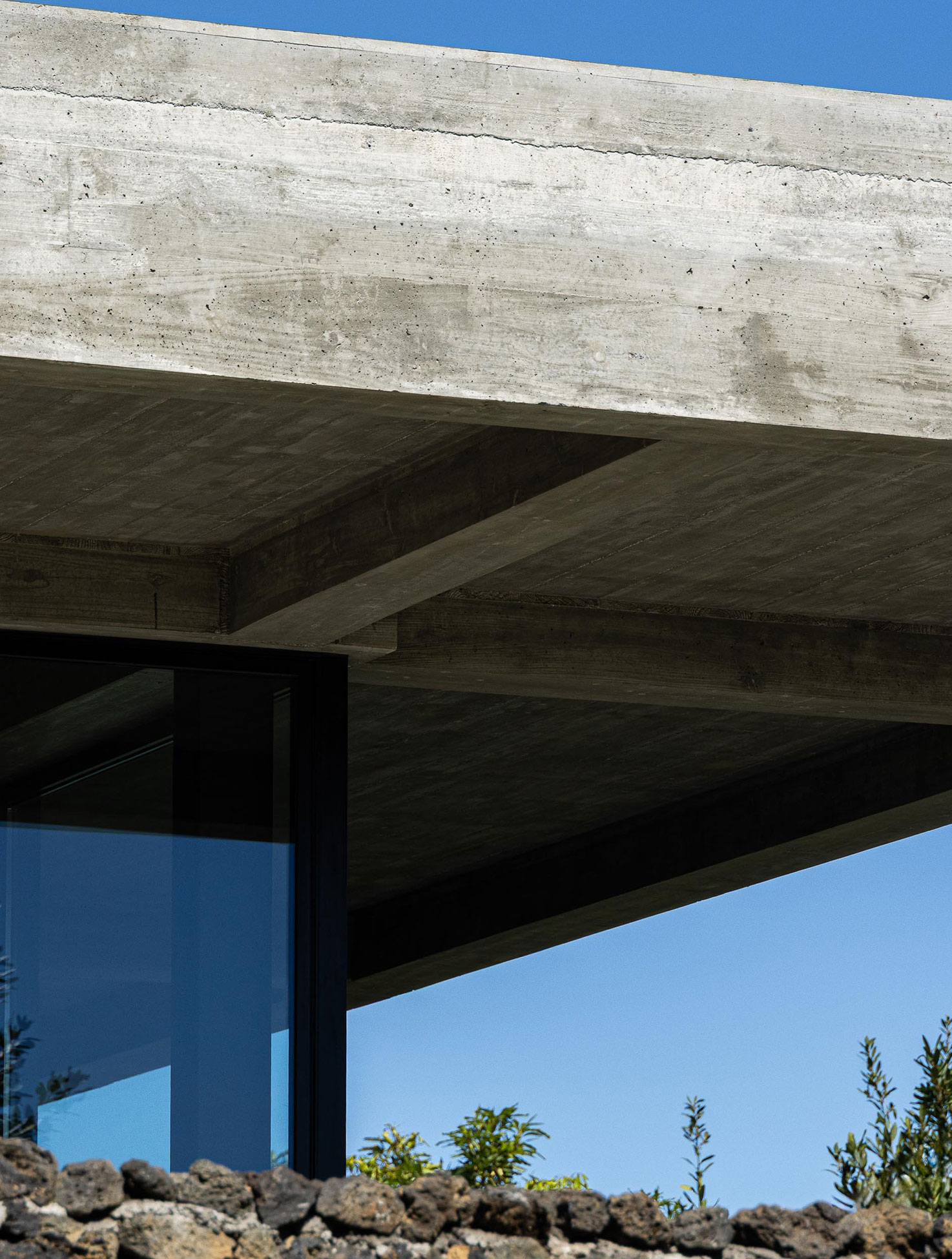 The site, on the southern coast of São Miguel Island, is defined by basalt boulders, dry vegetation, and irregular topography. Among rocks and brush, the house lands lightly, like a large wing hovering over the landscape. The idea of the wing came naturally. The owner was a former Air Force pilot during the colonial war, and the design of the house became a subtle metaphor for that past life.
