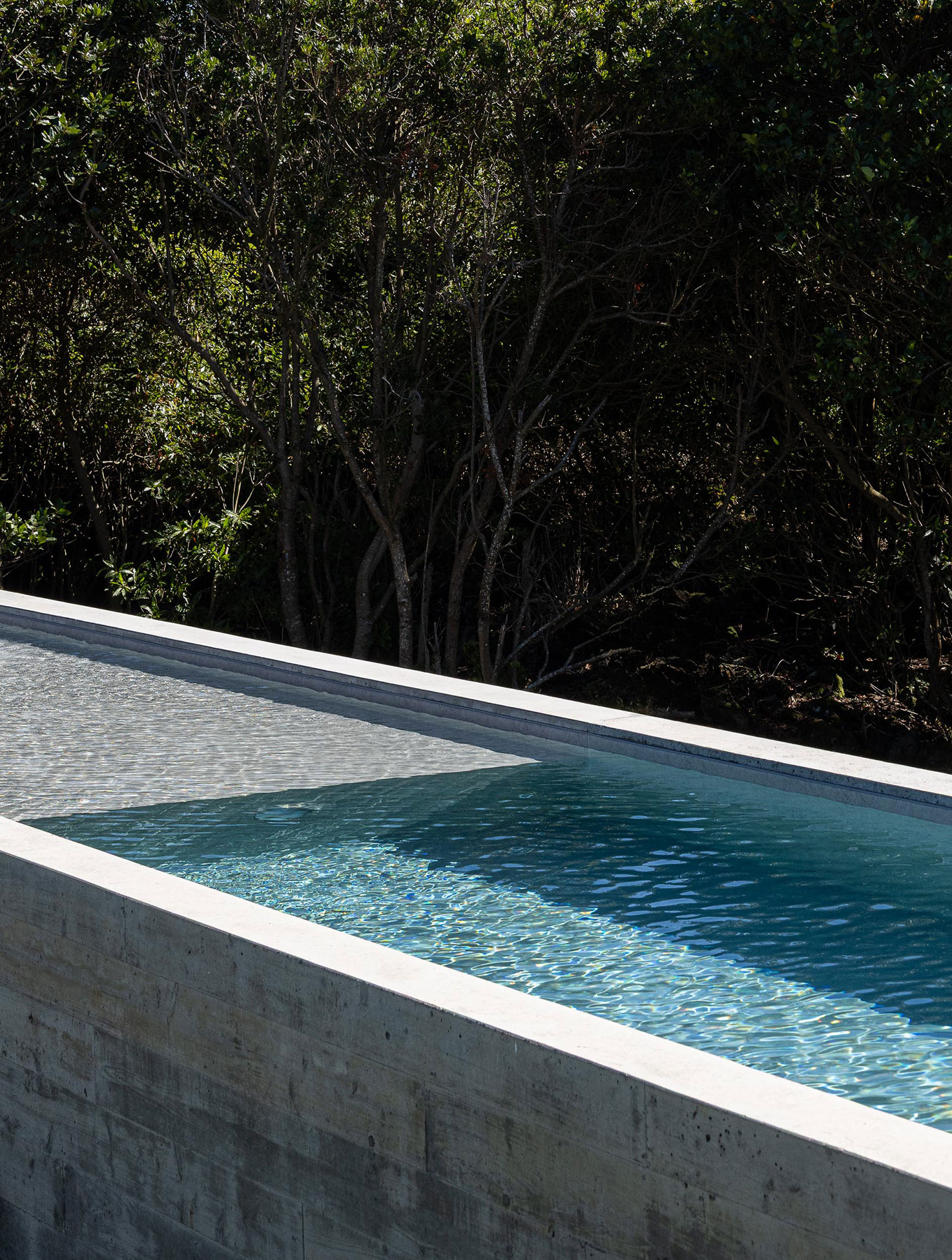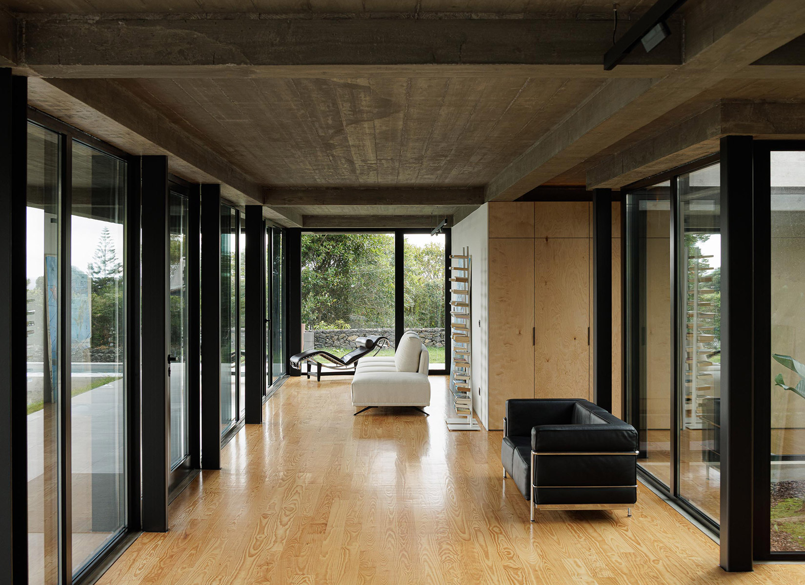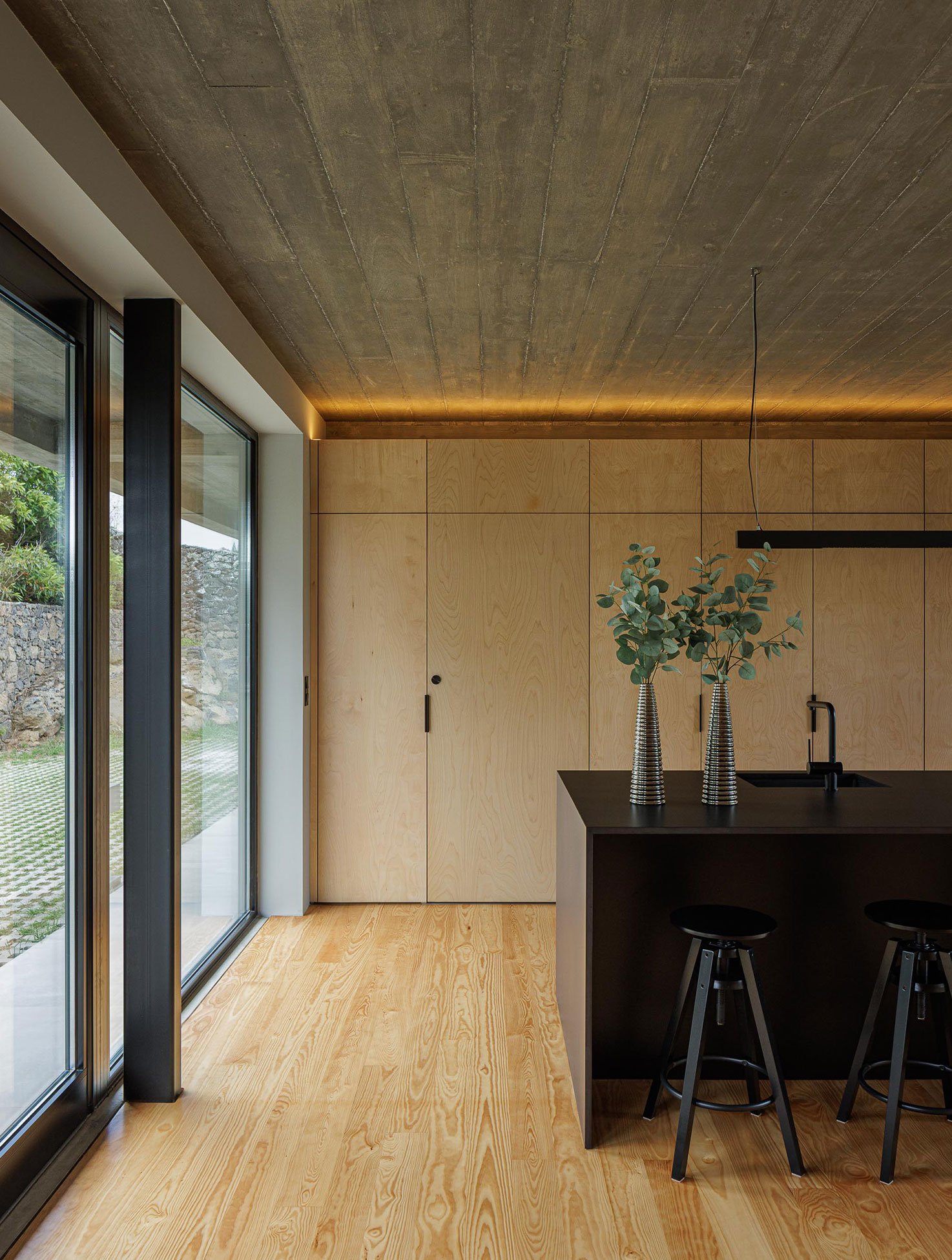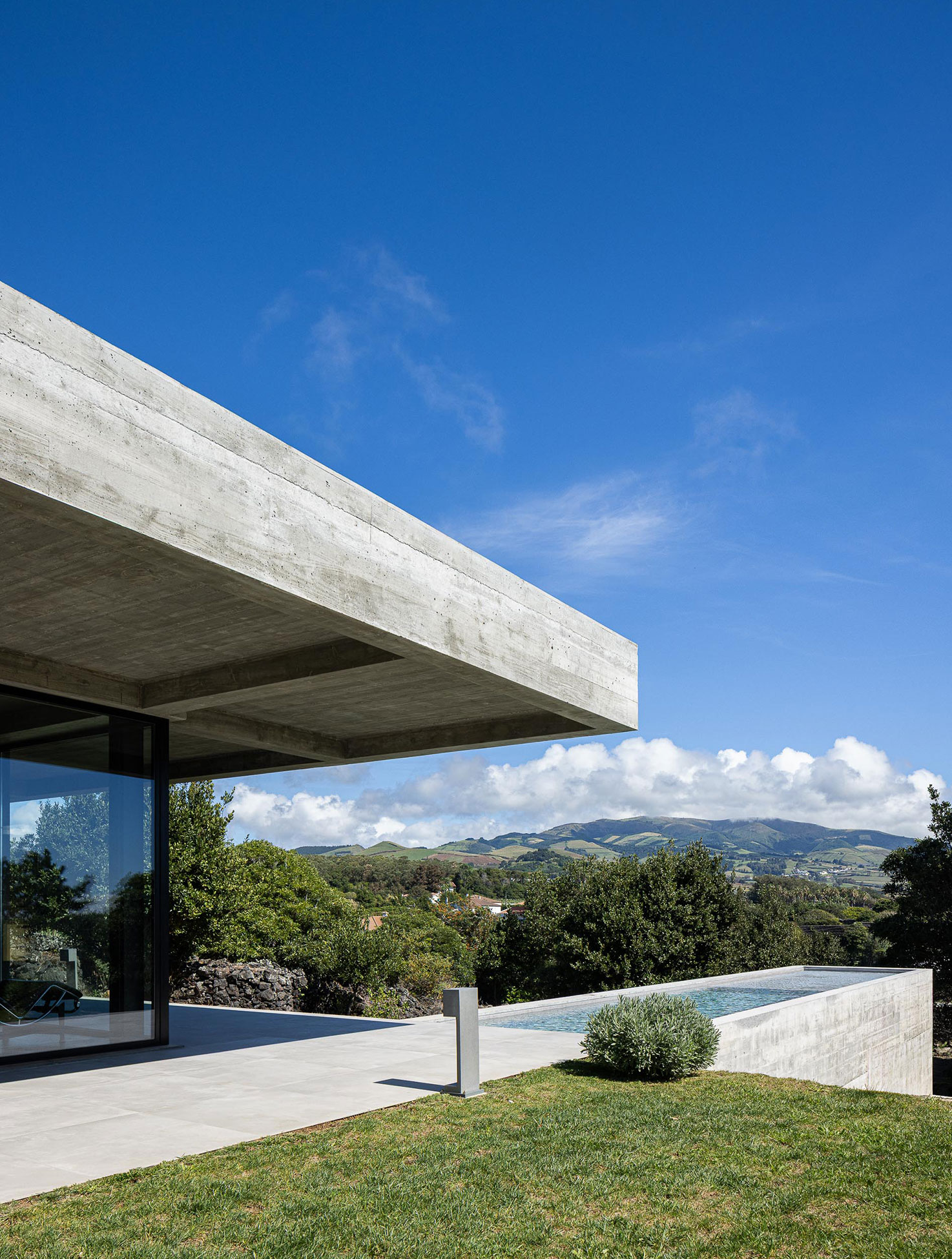 The site, on the southern coast of São Miguel Island, is defined by basalt boulders, dry vegetation, and irregular topography. Among rocks and brush, the house lands lightly, like a large wing hovering over the landscape. The idea of the wing came naturally. The owner was a former Air Force pilot during the colonial war, and the design of the house became a subtle metaphor for that past life.