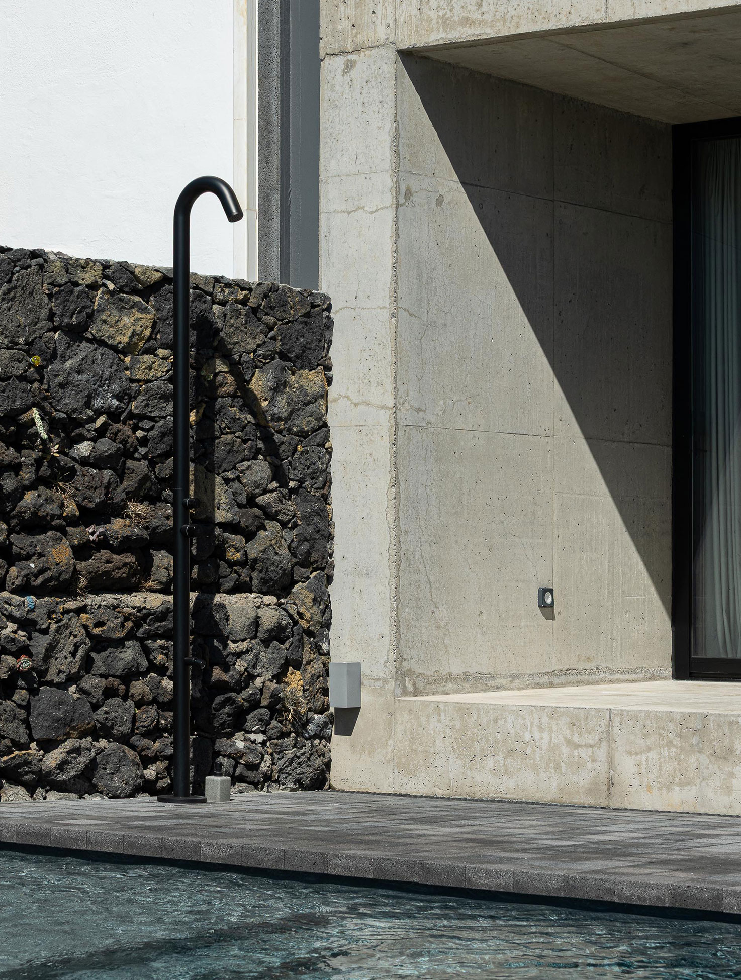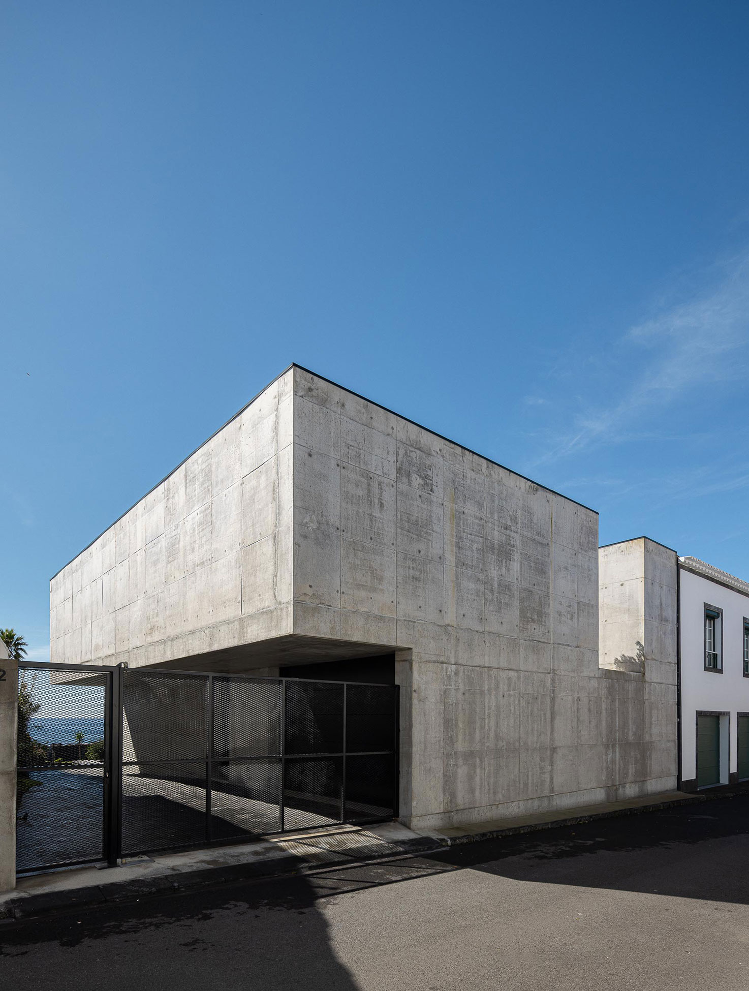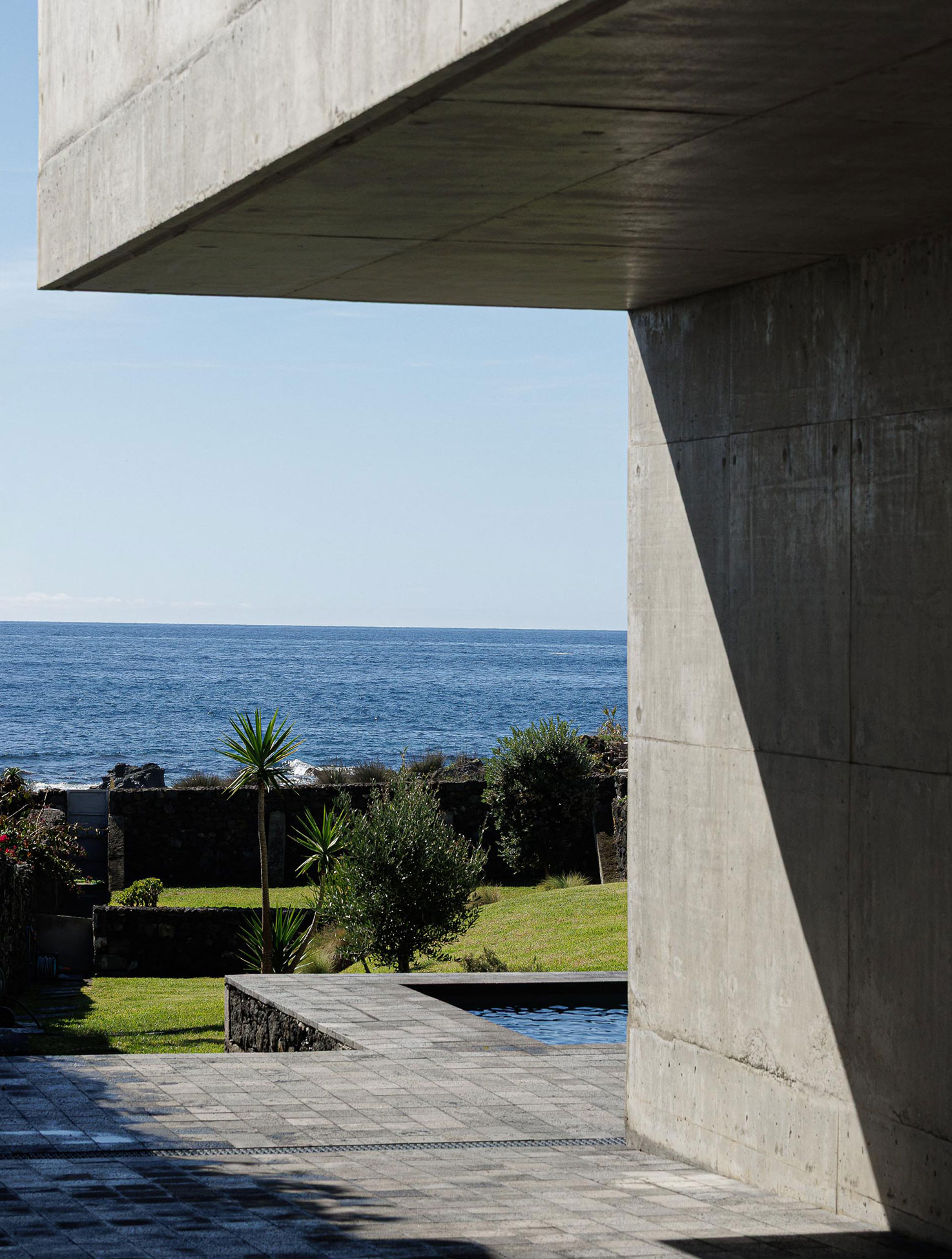 The project emerged in a particular context: a house designed for the parents of one of the studio’s founders. That gave us both freedom and responsibility. The chance to design without noise, without concessions, almost as if starting from a blank page. The plot, the last empty lot along a stretch of São Miguel’s southern coast, called for a solid piece. Between old constructions and a harsh Atlantic landscape, the house stands as the closure of a block and, at the same time, as a natural extension of the rock.