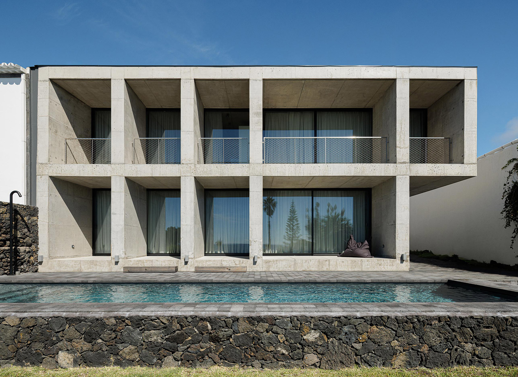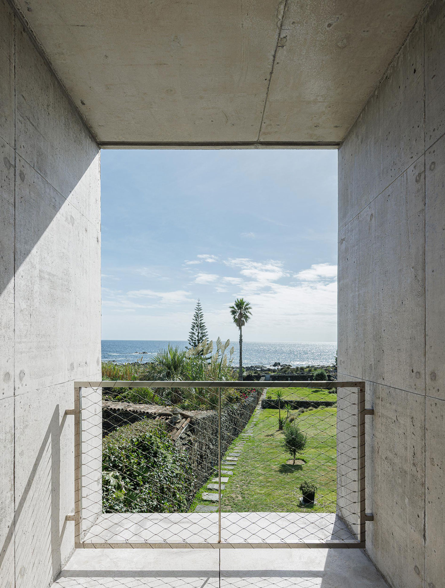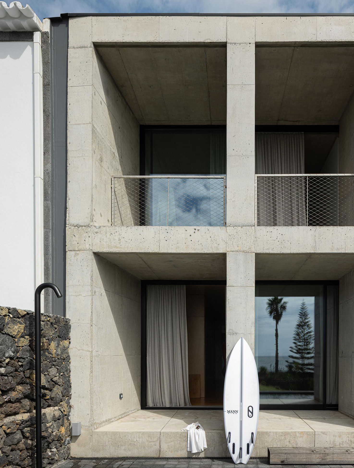 The choice of exposed concrete was obvious. A material resistant to time and salt. Raw, yet honest. The building presents itself to the street as a mineral mass composed of solids and voids. The openings, recessed and protected, reveal little of the interior. From the outside, the house seems almost uninhabitable—a new ruin, a sequence of caves on the Rocha Quebrada.