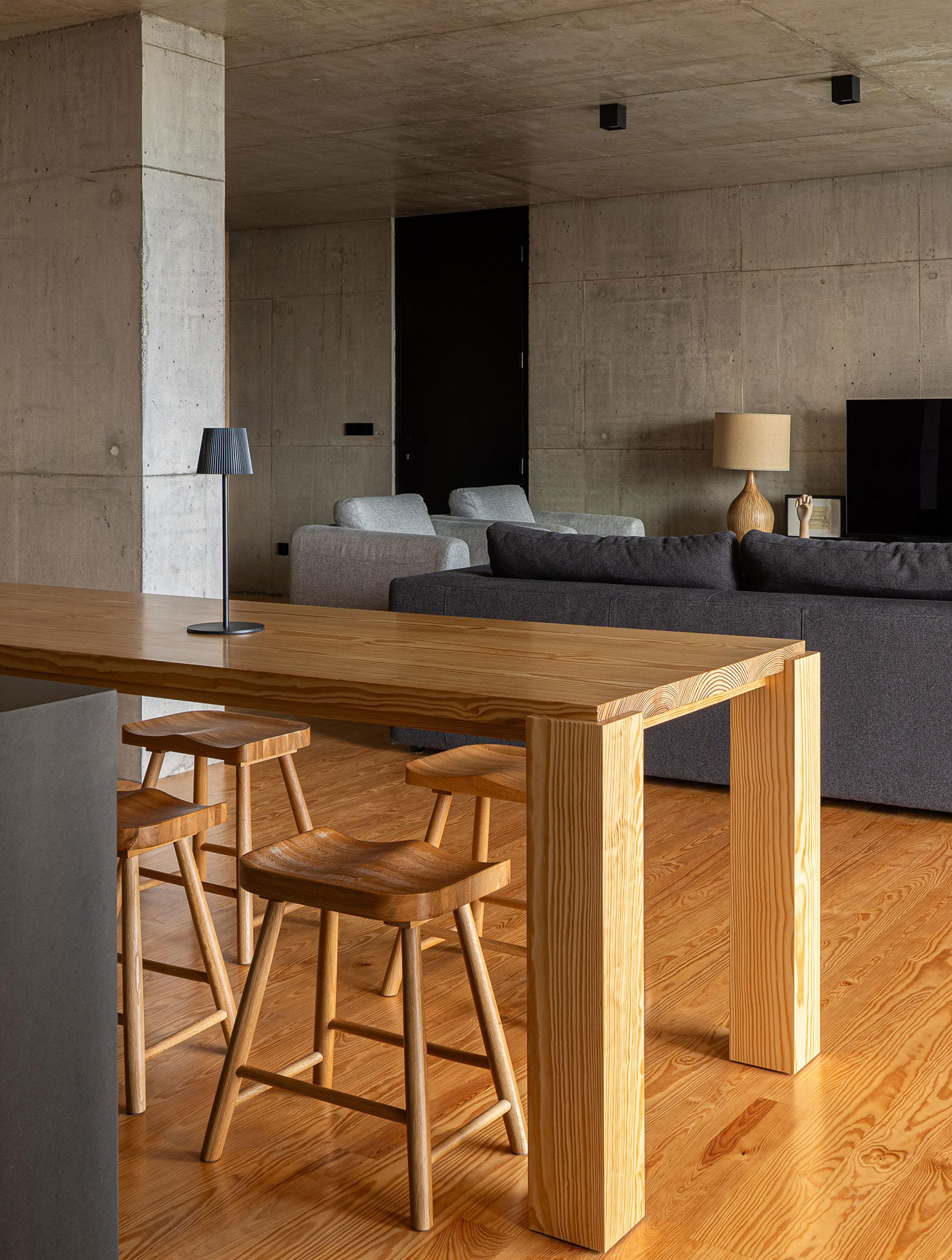 But these caves are habitable. Inside, wood warms the space and contrasts with the coolness of the concrete. The layout is simple: three bedrooms, an open and fluid social area, naturally ventilated and illuminated by a central patio that cuts through the volume. Everything that isn’t essential, doesn’t exist.