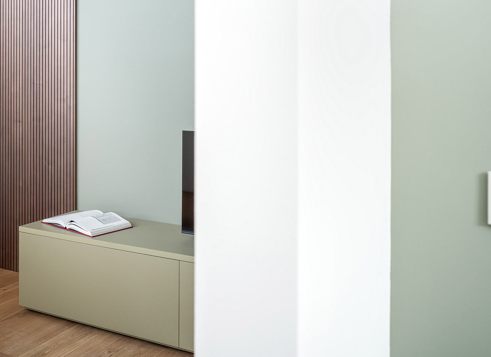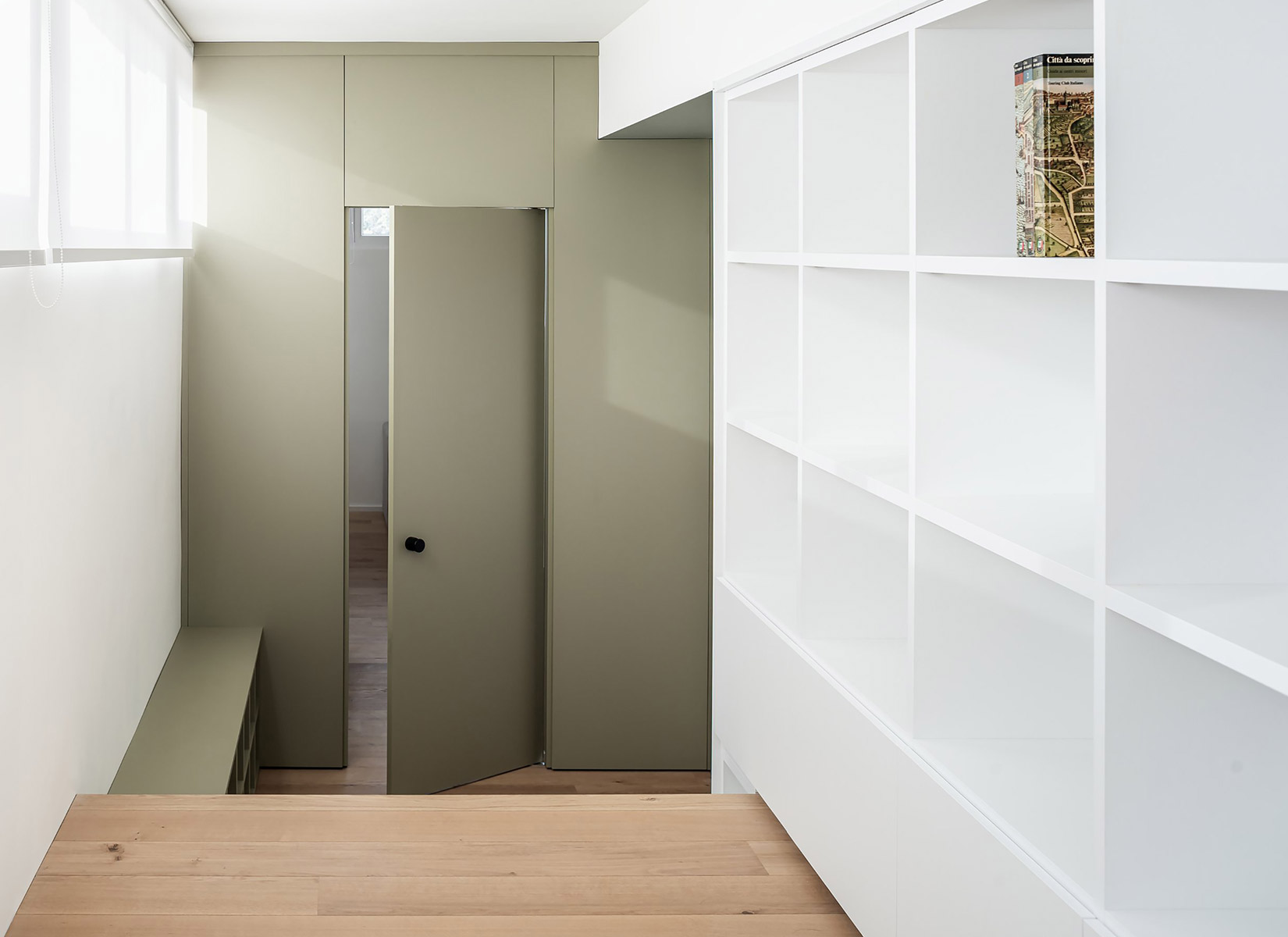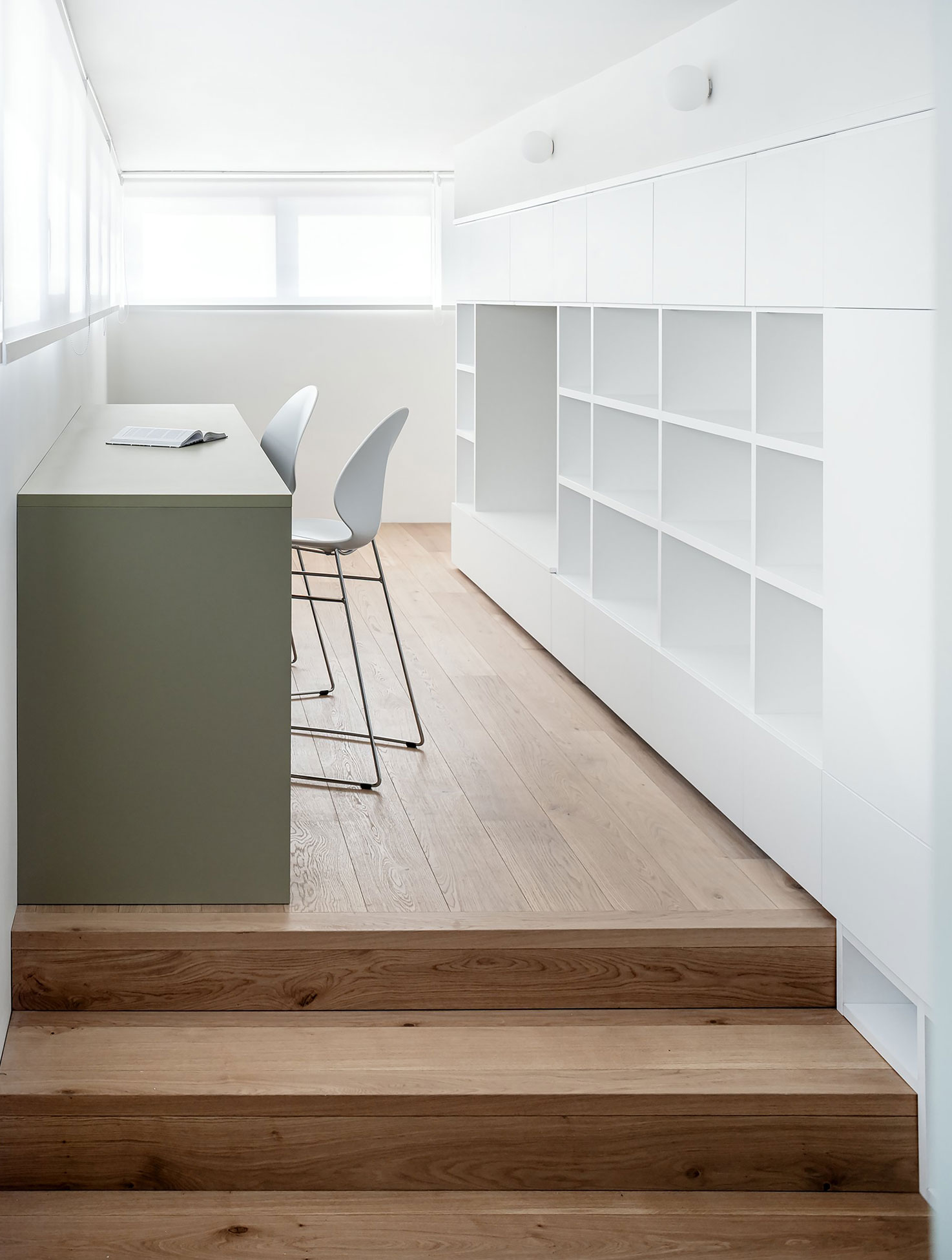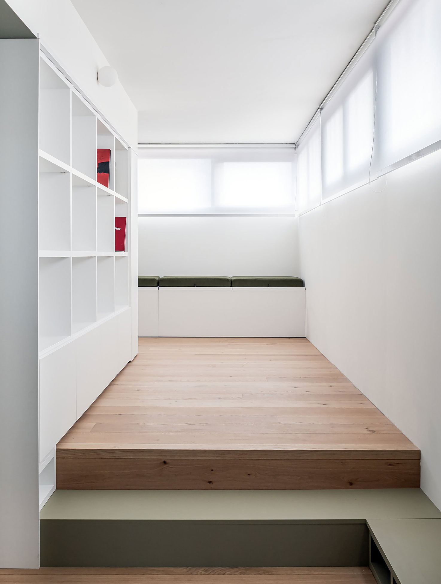 The intervention turns these constraints into the project’s generative principle, reinterpreting the corridor not as residual circulation but as an inhabitable spatial sequence. The layout is articulated through a calibrated system of level changes—raised platforms, steps, and inhabitable volumes set at different heights—that redefine the spatial order and introduce a narrative reading of the domestic environment. Rather than relying on purely functional zoning, the project constructs a fluid and rhythmic path that progressively guides both movement and gaze toward the exterior panorama.
