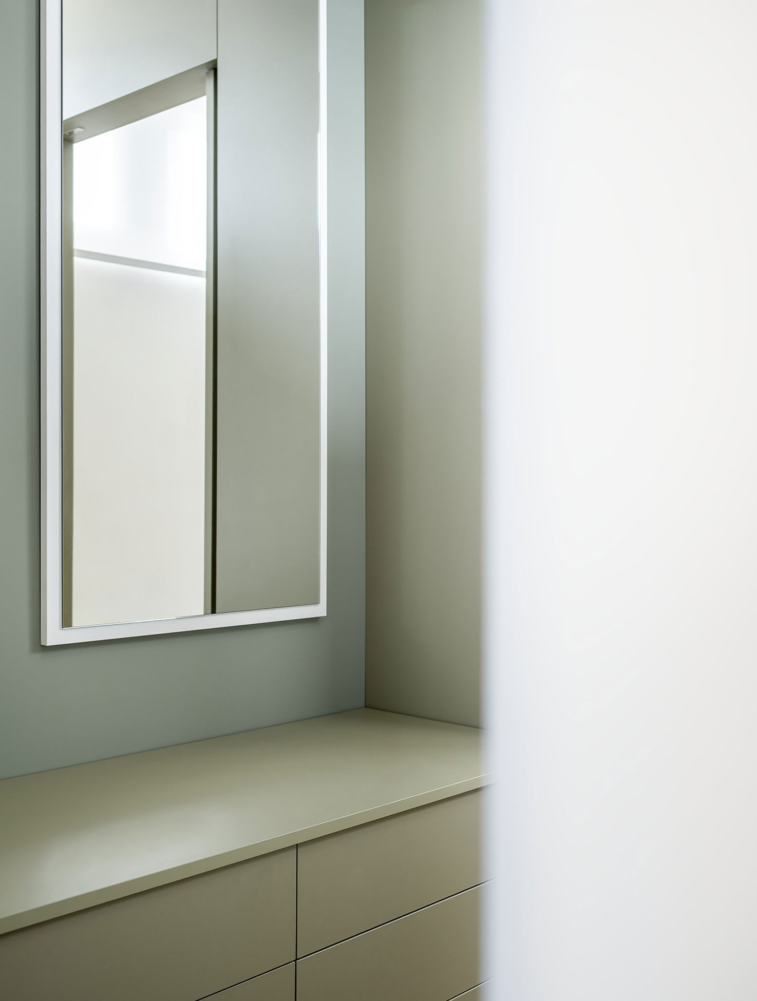 The kitchen is conceived as an architectural screen: a compact and precisely proportioned element that organizes the main space while concealing a flexible room behind it, capable of accommodating different uses over time—including an additional sleeping area—without compromising visual and spatial continuity. Throughout the project, careful attention to rhythm, thresholds, and the relationship between body, space, and natural light shapes a calibrated spatial sequence in which level changes, openings, and voids produce a dynamic domestic experience. Essential forms and a restrained architectural language define a deliberately neutral interior, allowing the landscape to remain the main protagonist. In the completed loft, the former corridor becomes an inhabited spine—an interior promenade that organizes daily life while reinforcing the dialogue between the built space, light, and the lake panorama.