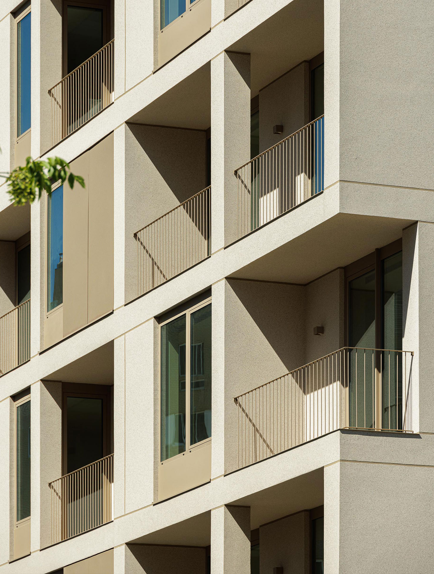 This stepped configuration also generates a vertical landscape. Greenery climbs from street level to the higher floors, softening the façade and extending nature into every apartment. The overlapping balconies allow subtle visual connections between dwellings, creating opportunities for neighbourly interaction, a sense of collective identity, community feeling and engagement.