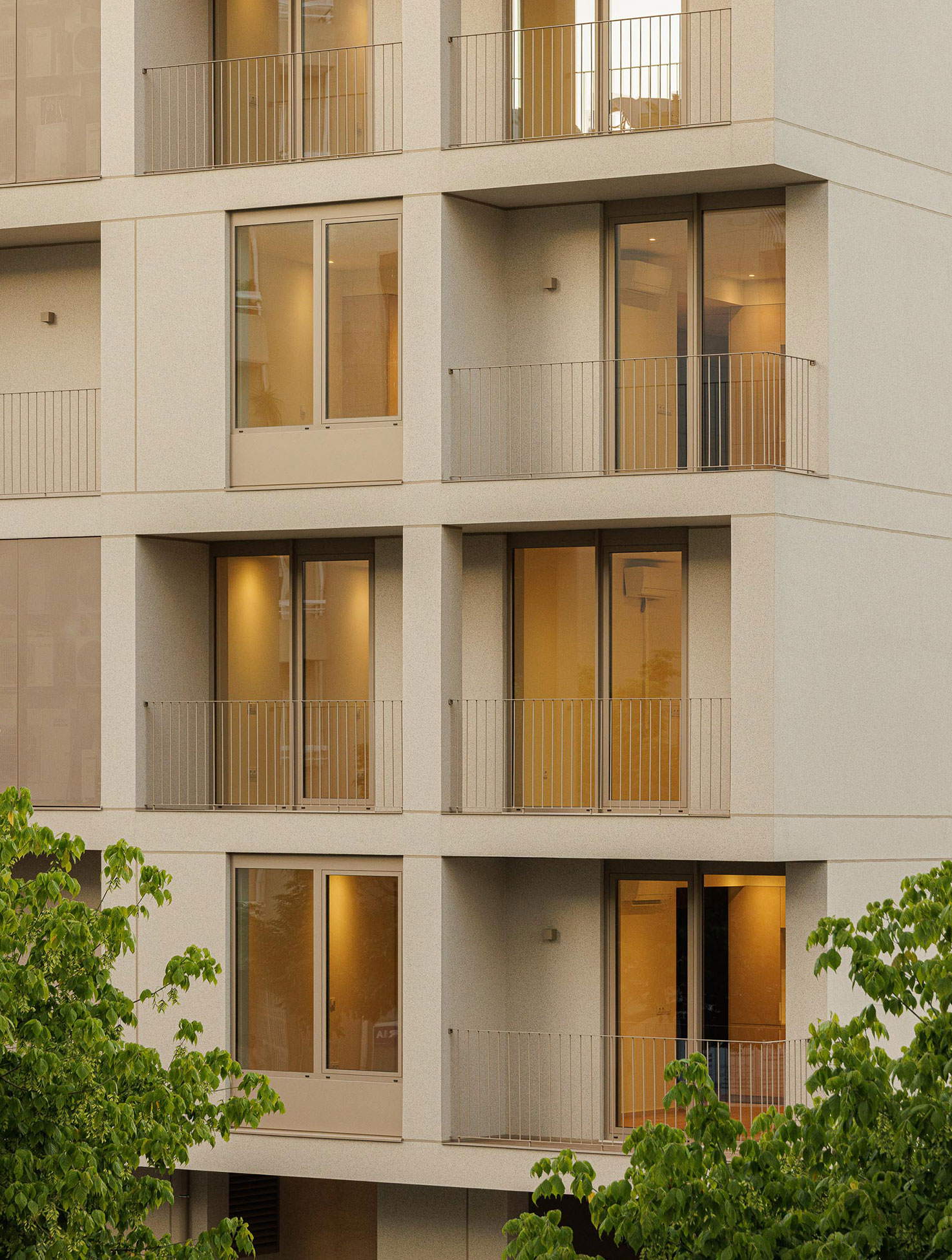 Inside, the apartments are designed to be spacious, within the current downsizing market needs, with abundant natural light and high thermal, acoustic, and visual comfort standards. Careful material selection enhances this quality, with refined finishes and warm details such as timber entrance halls that lend character and warmth to the shared areas.