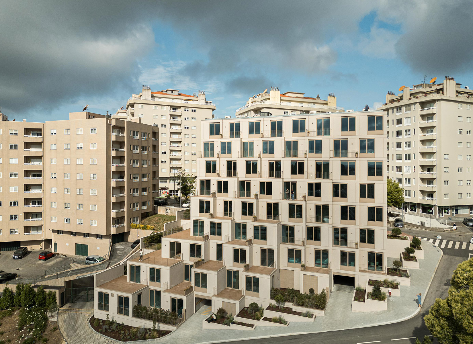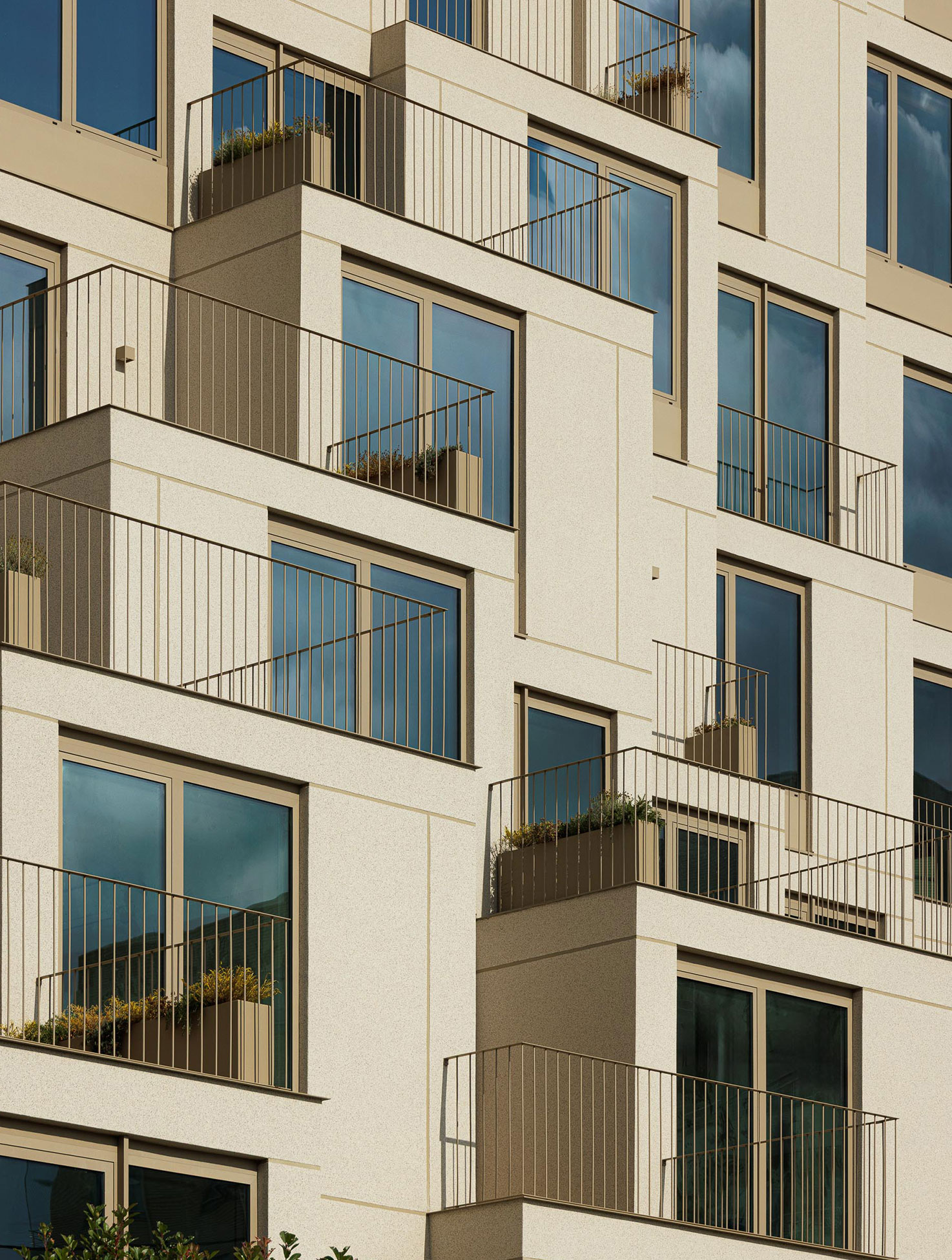 The terraced form serves multiple purposes. Compared to the predicted rectangular box, it maximises saleable area while potentiating apartments with generous daylight, natural ventilation, and expansive views. Outdoor spaces become a defining element: larger terraces at the lower levels connect strongly with the ground, while slimmer balconies higher up establish a balanced hierarchy, redistributing value across the building instead of concentrating it at the top.