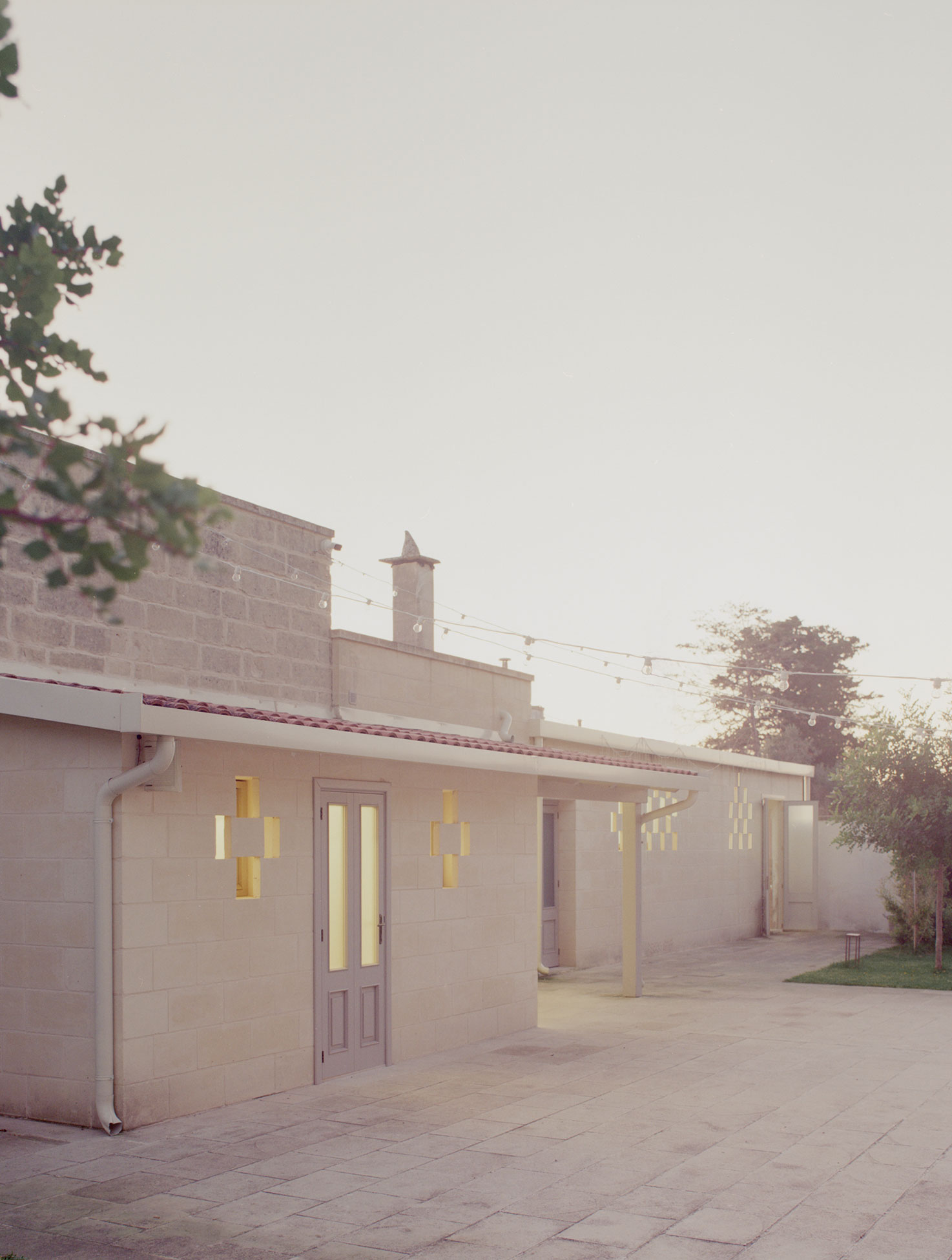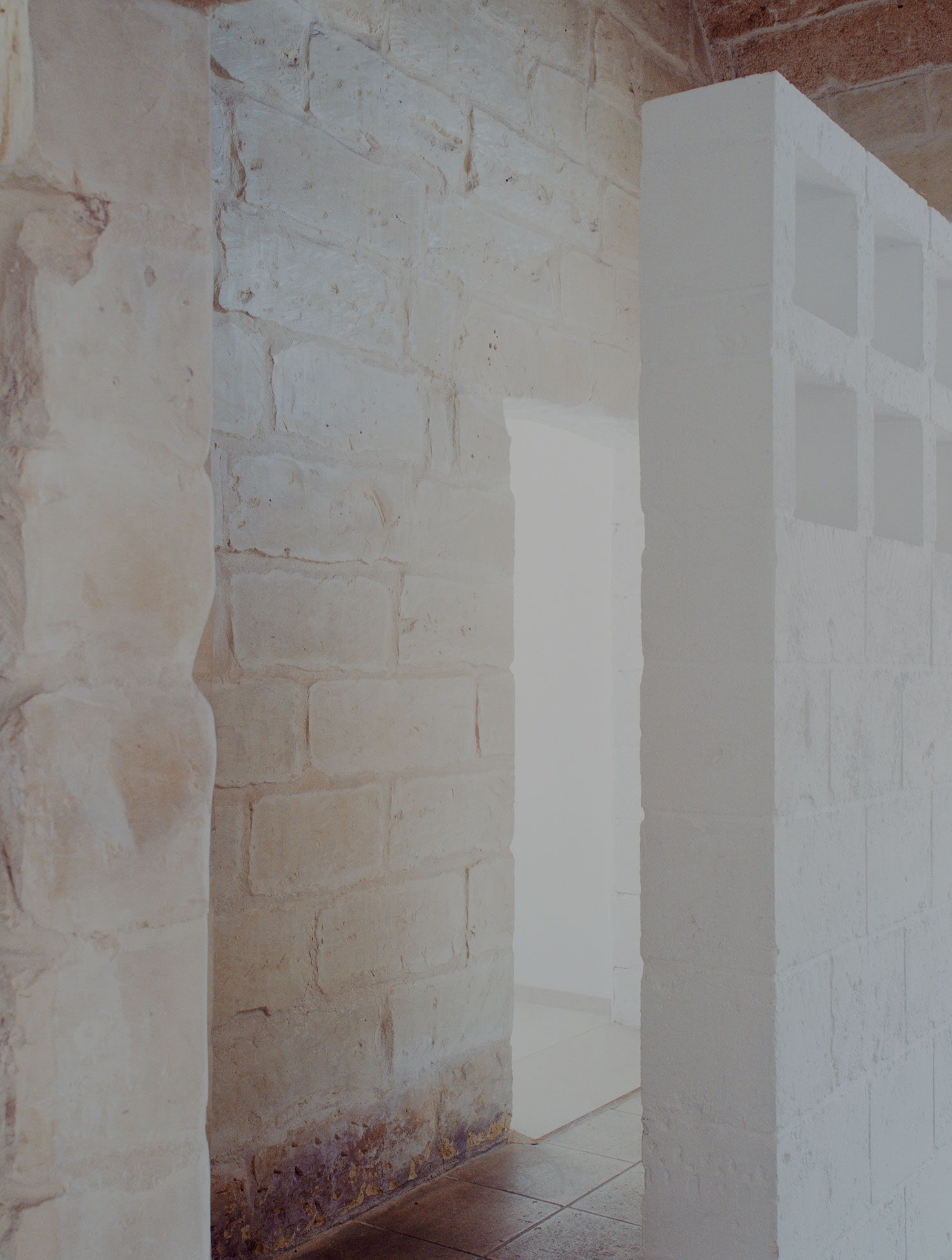 Before the intervention, the structure presented numerous discrepancies and inconsistencies, dictated by numerous additions carried out without a conservative approach. Margine’s work thus appears to be an architecture of subtraction: removing the false coverings, eliminating the inconsistent finishes, camouflaging the antithetical structures. In restoring the pure and warm image of the Lecce stone building, the repurposing of the spaces occurred through three simple, targeted, essential, and informative interventions: a bench, a fireplace, and a partition. All three elements were constructed of tuff stone and whitewashed with limewash to highlight the contemporary intervention compared to the original structure.