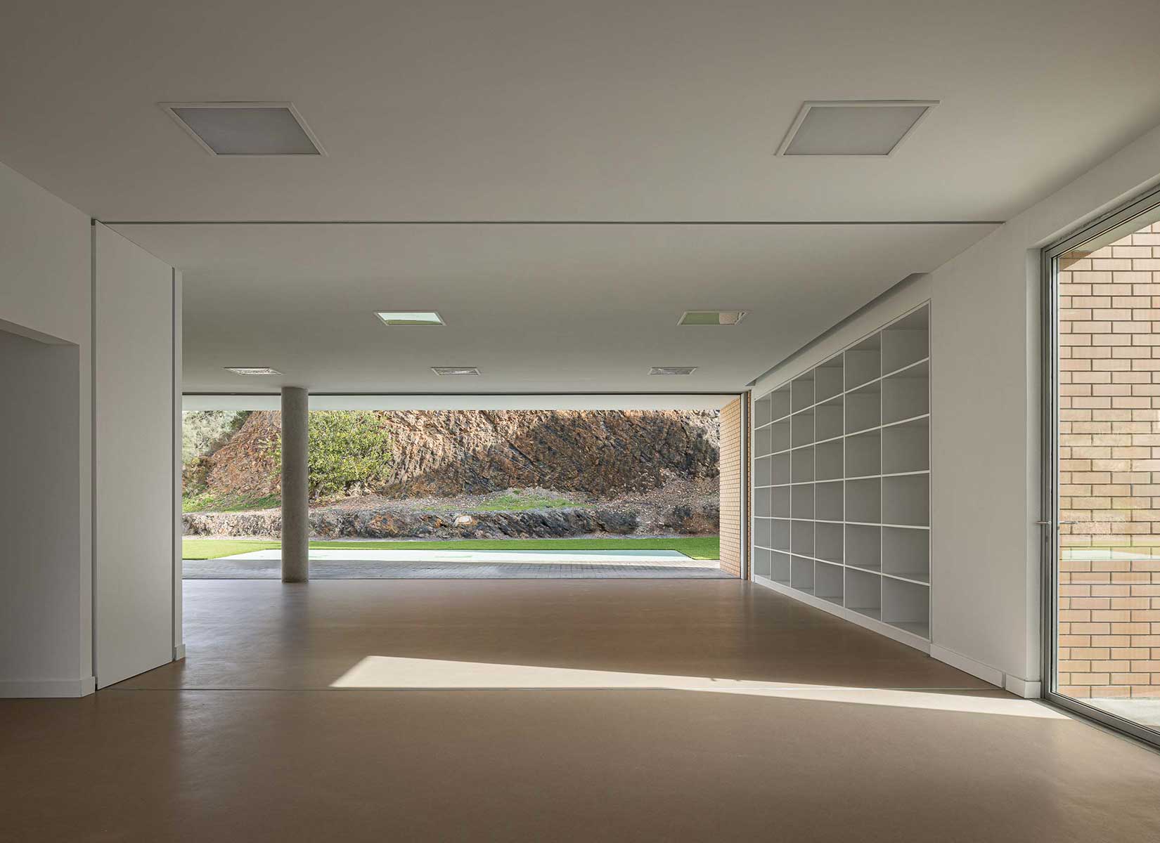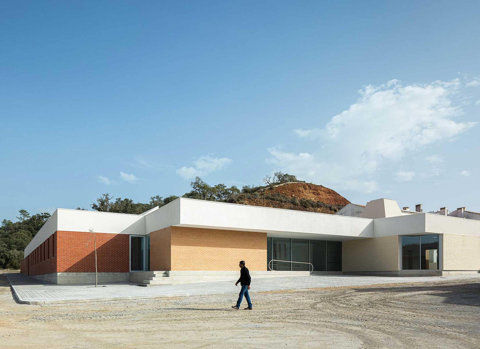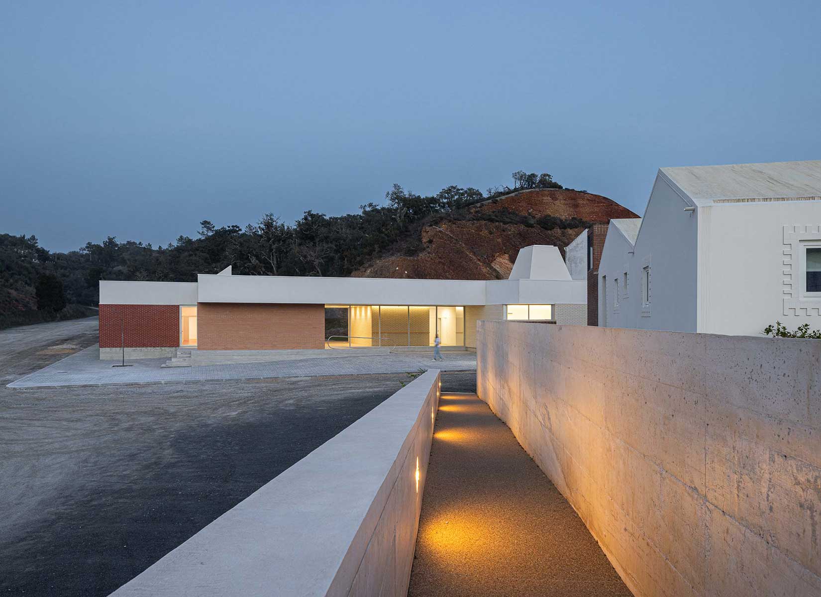 The project for the Cerebral Palsy Association of Odemira (APCO) consists of an occupational activities center located in Quinta da Estrela, Odemira, Portugal. The building is organized in a L-shaped layout that faces a cliff hillside, leading to an outdoor patio easily controllable in terms of access, thus ensuring the safety of its users, as well as their privacy. What was once a “eyesore” inside the Town, a jagged hillside, has now been transformed into a sculpturally aesthetic and central element of the courtyard. The geometrization of the outer space transformed chaos into harmony. Poetics arises from the contrast between order and controlled chaos.