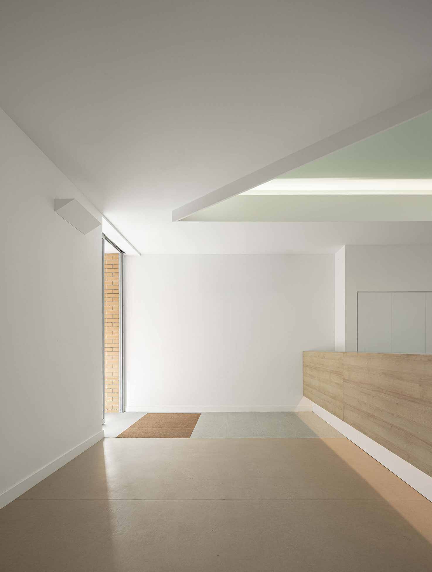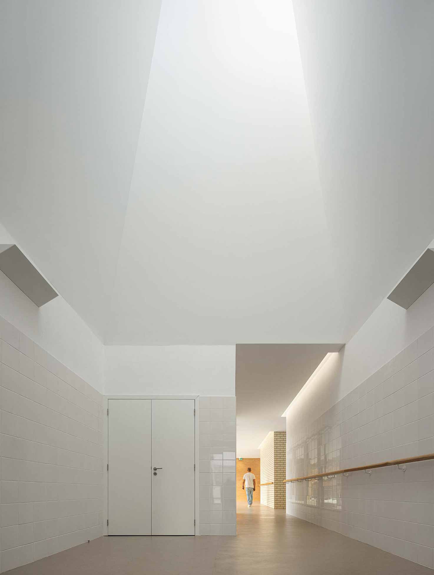 The flow of the building is viewed as an “architectural promenade”, with the reception as the “departure house” marked by a green arrow. The created L-shaped path, provides variety and spatial orientation and promotes wandering around the building, culminating in two zenithal light entrances of a distinct nature: a pyramidal atrium near the activities room and a large clerestory that functions as a “sundial” and exhibition space for users Art.