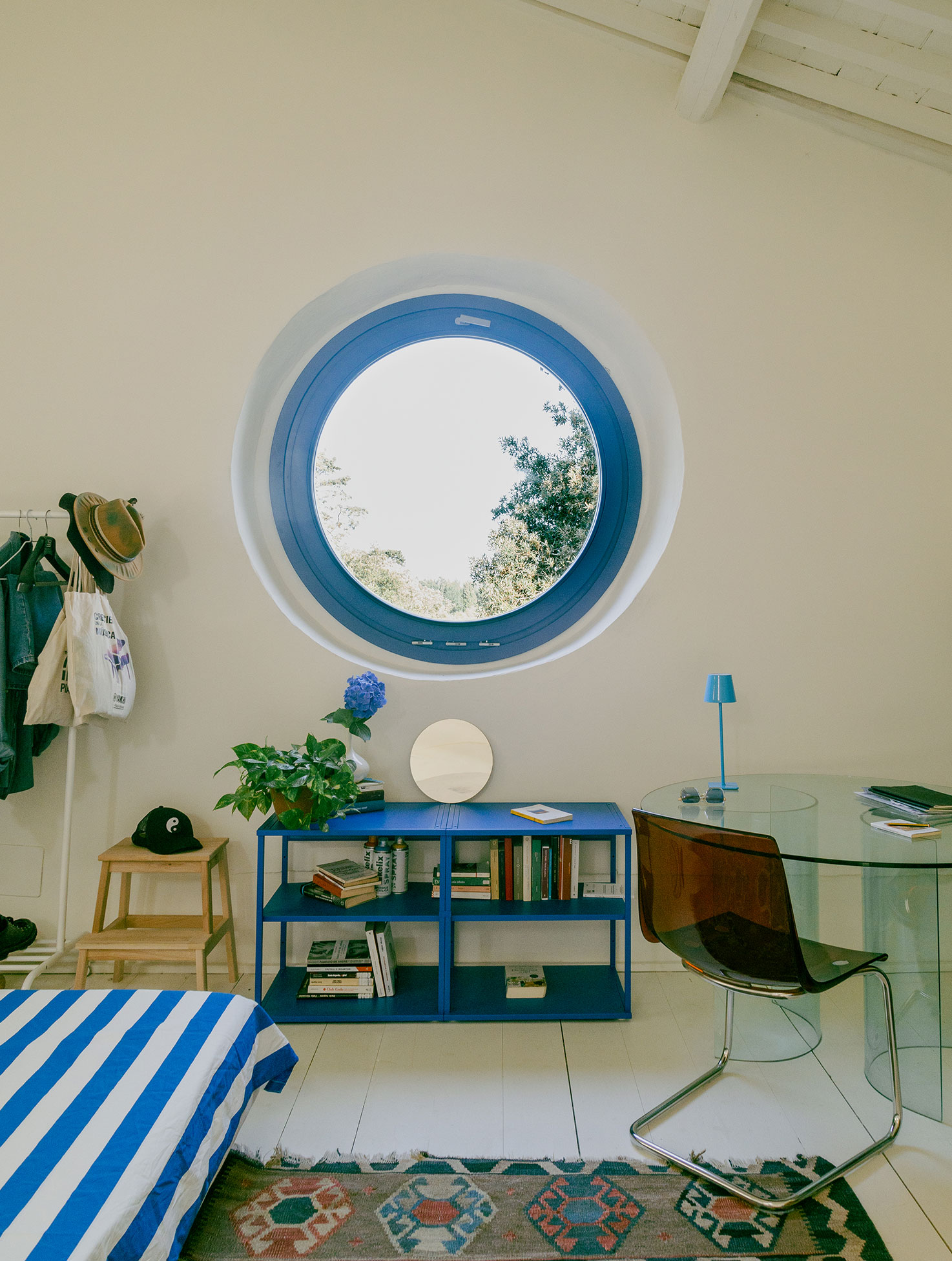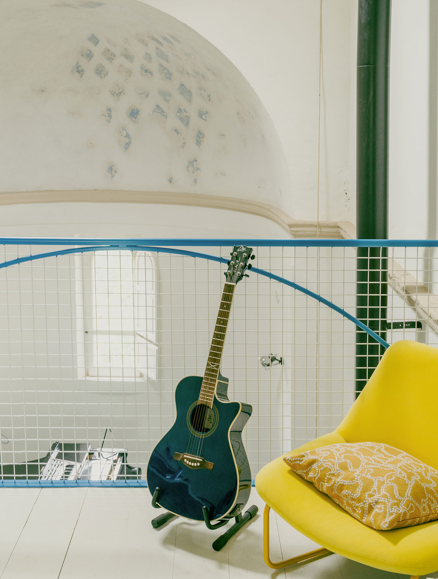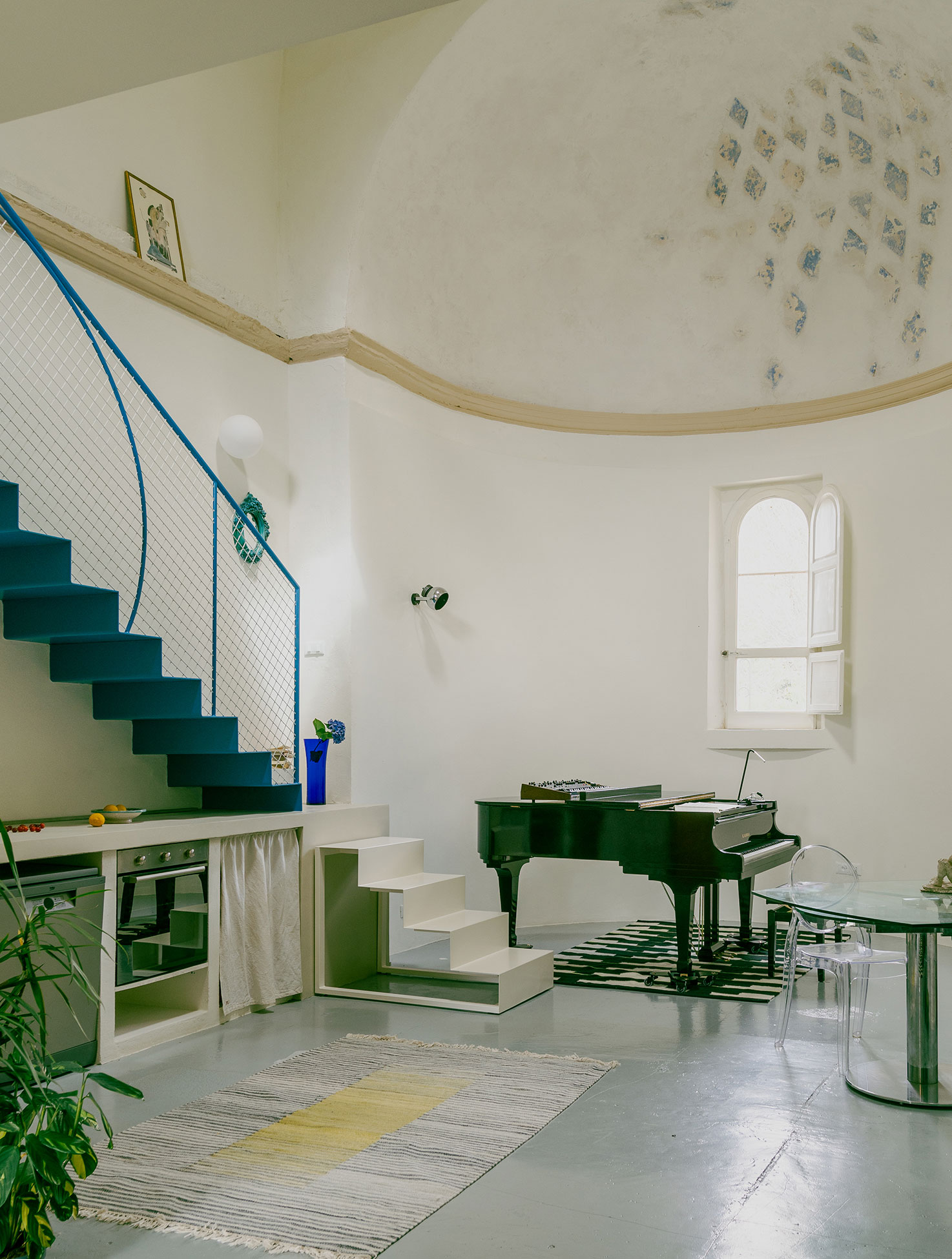The Pailunga project, designed by Atelier Vago, transforms a small deconsecrated chapel in the Tuscan countryside into an artist residency. The original nave is preserved, while new functions—kitchen, services, a self-supporting iron staircase, and a wooden mezzanine for the sleeping area—are inserted with minimal impact, maintaining the central hall intact. Bright colors, such as the vivid blue of the staircase, create a deliberate contrast with the historic structure, highlighting its surviving traces. The apse, now dedicated to the piano, becomes the symbolic heart of the space, merging art with spirituality. Externally, no alterations were made: existing greenery and framed views of the landscape strengthen the dialogue between architecture and nature.