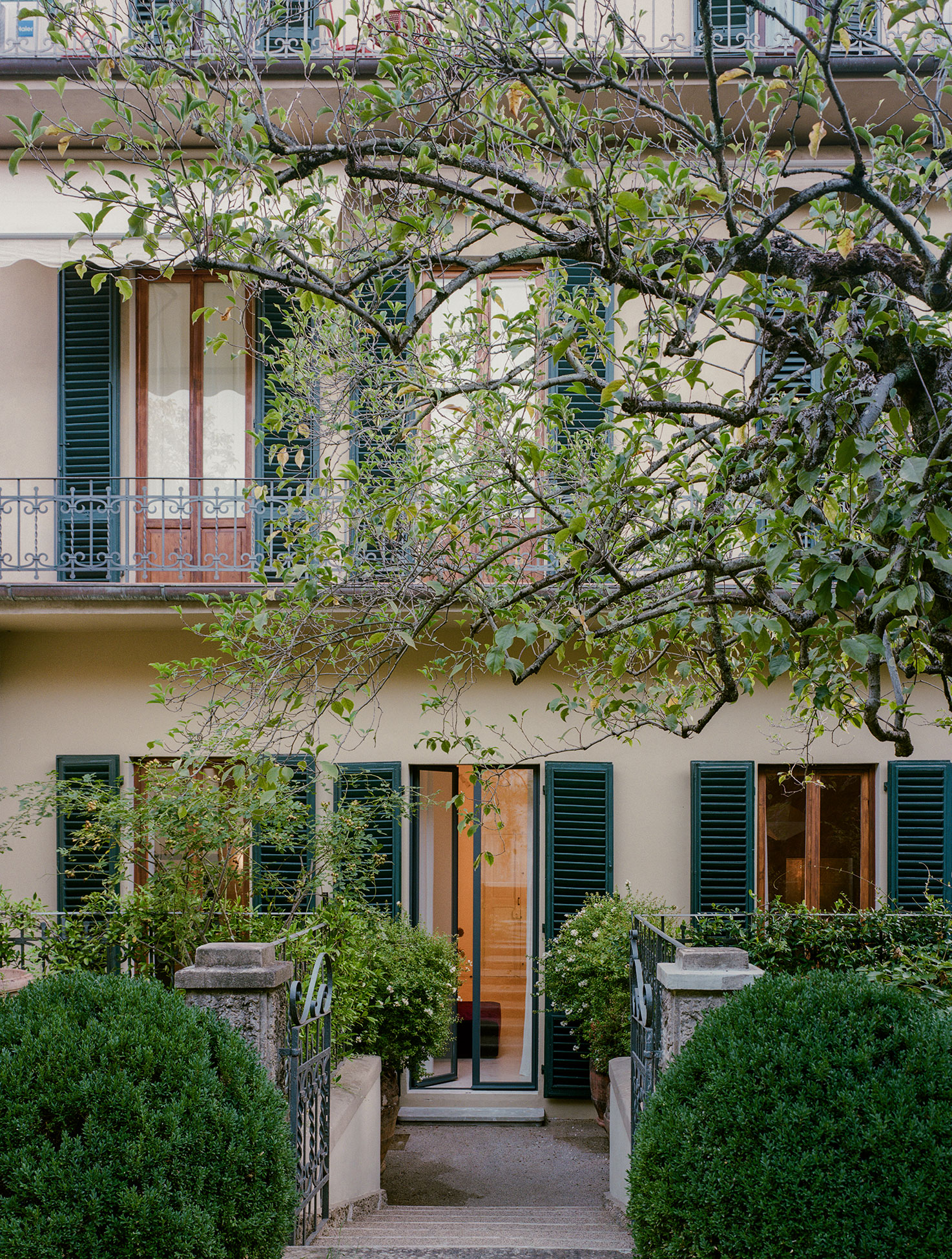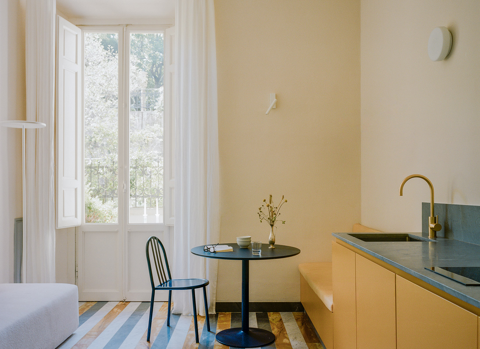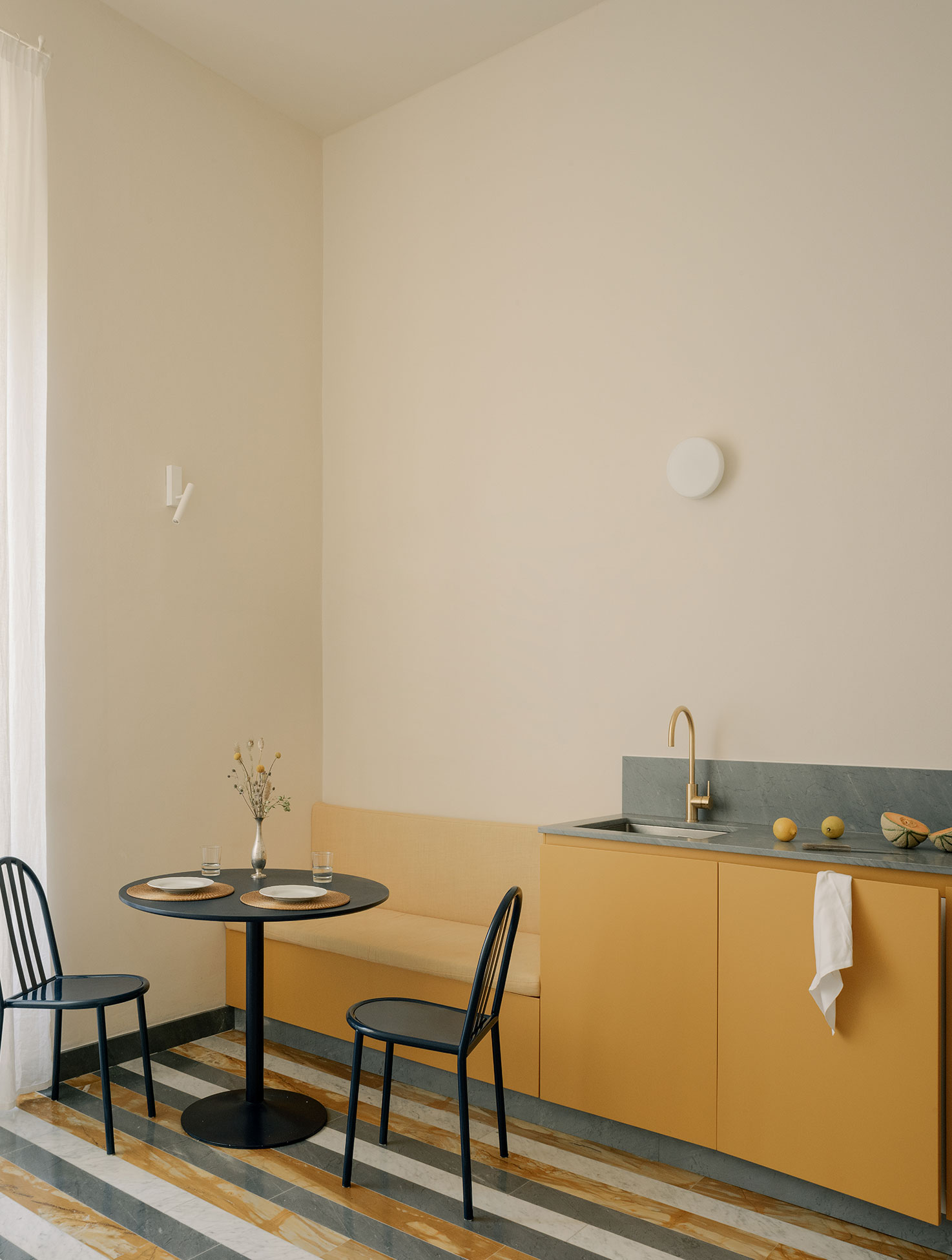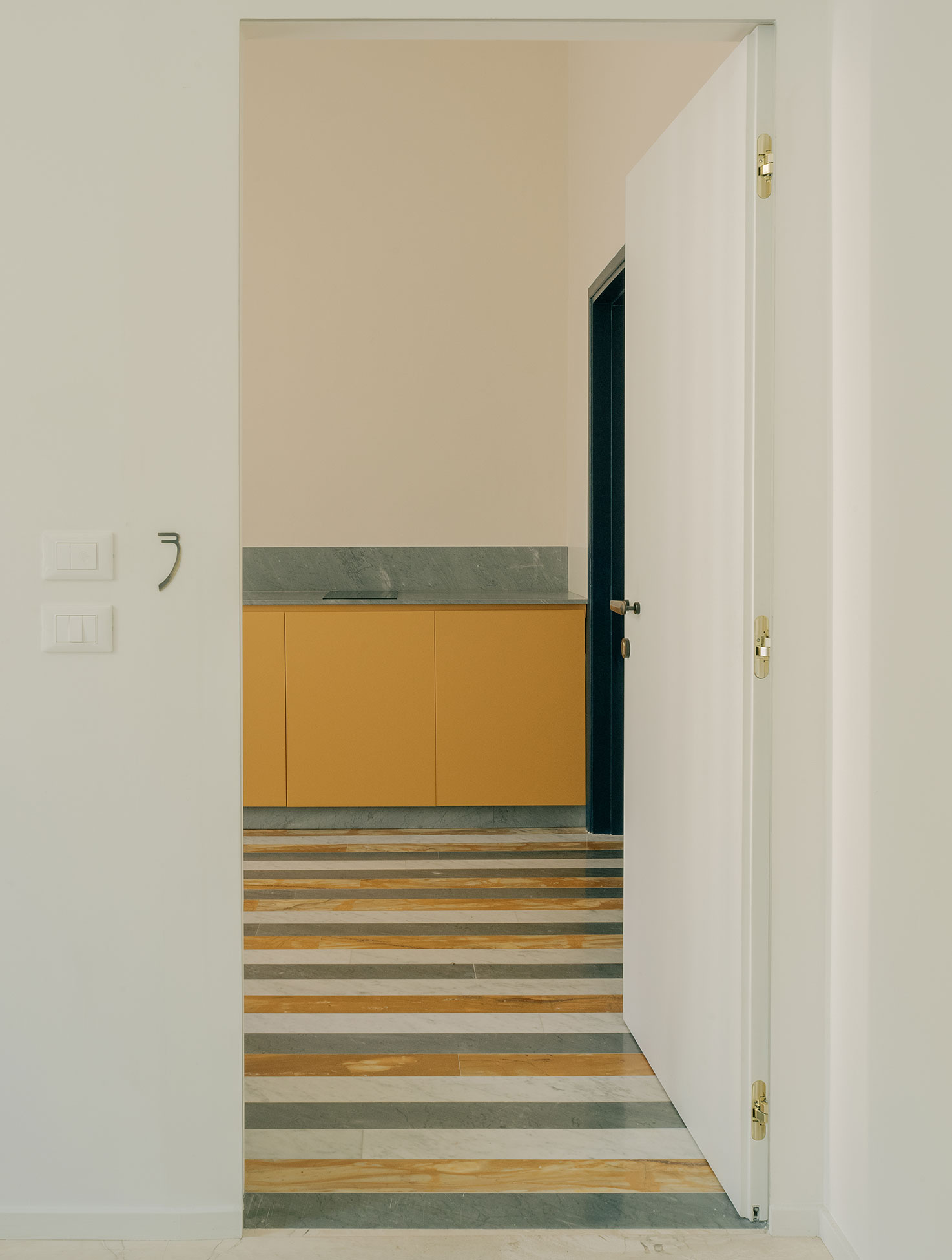 In Florence’s Porta Romana neighbourhood, an early 20th-century building has been restored and renovated by eight young Florentine creatives, with a view to reinterpreting the spirit of the building’s foundation in a contemporary key. AFSa’s proposal revisits the aesthetics of the 1920s through the suggestions of Adolf Loos’s Ornament and Crime, creating a refined and sensual atmosphere in which the polychrome marble floor plays a leading role. The flooring design, which contrasts 12 cm strips in Bianco di Carrara, Giallo di Siena and Bardiglio, recalls both the Romanesque tradition of marble bands in Florence and Gio Ponti’s iconic ceramics for Richard Ginori. The motif defines the style of the custom-designed furnishings, balancing homogeneity and contrast throughout the space.