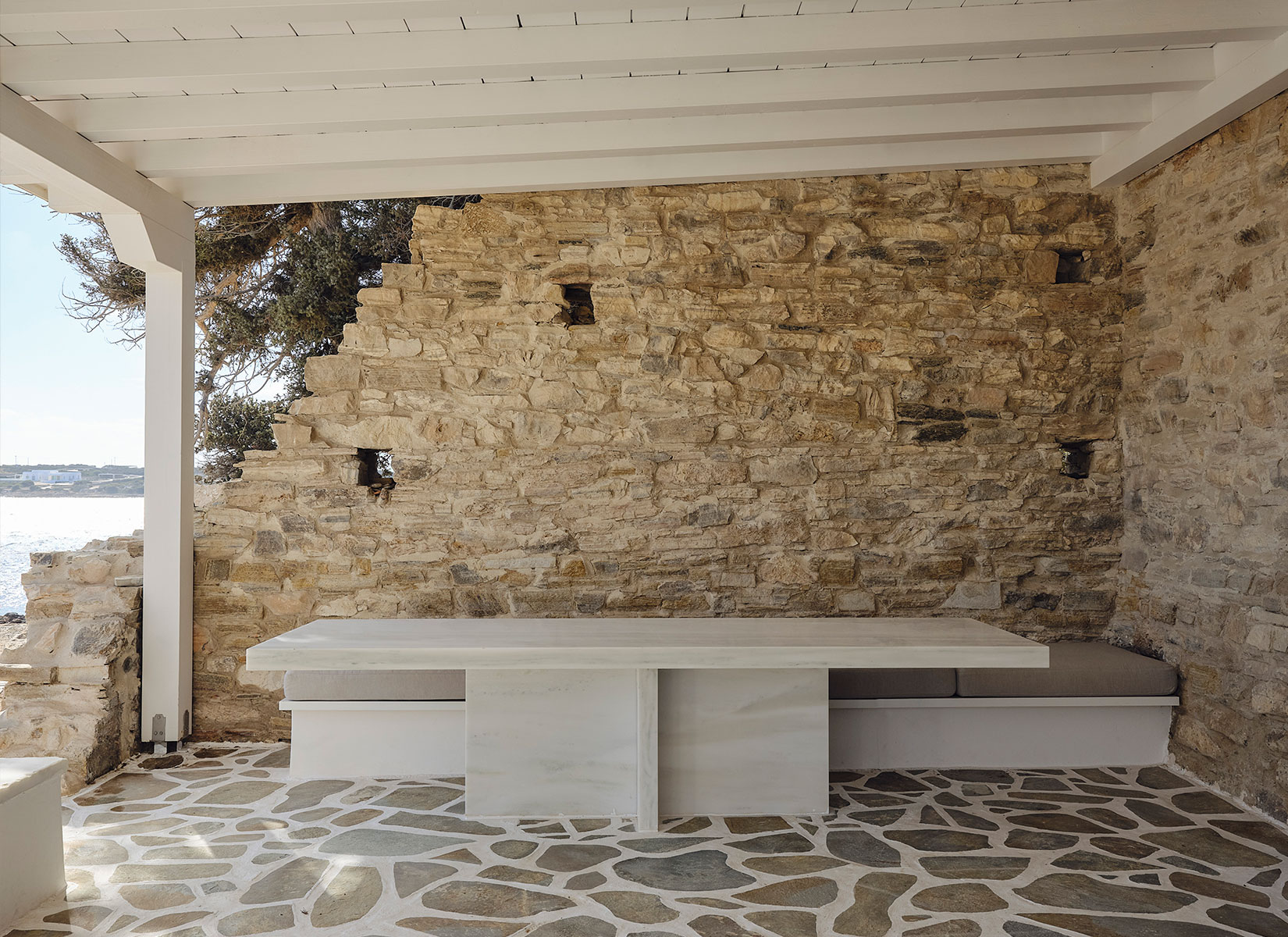 Our first important decision was to respect the building’s idiosyncratic character and treat it as a restoration project, despite its lack of official heritage listing. The building’s landmark status on the island and its role in the collective memory of the place guided our preservation approach. We maintained the exterior intact, restoring and regrouting the exposed stone walls where necessary. The only outdoor additions were a reclaimed marble sink on the exterior counter and a custom-designed Dionysos marble table. We also changed the shutters from dark brown to light blue to enhance the seaside atmosphere.