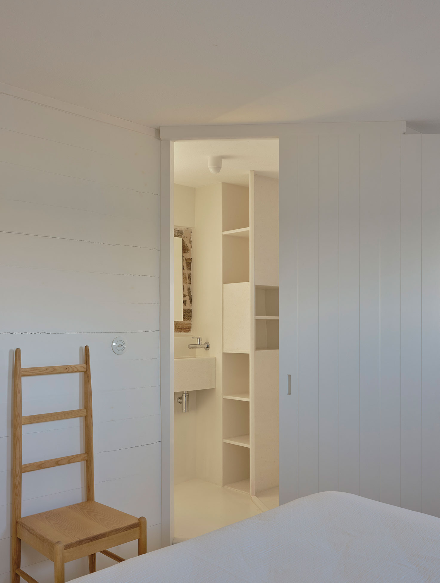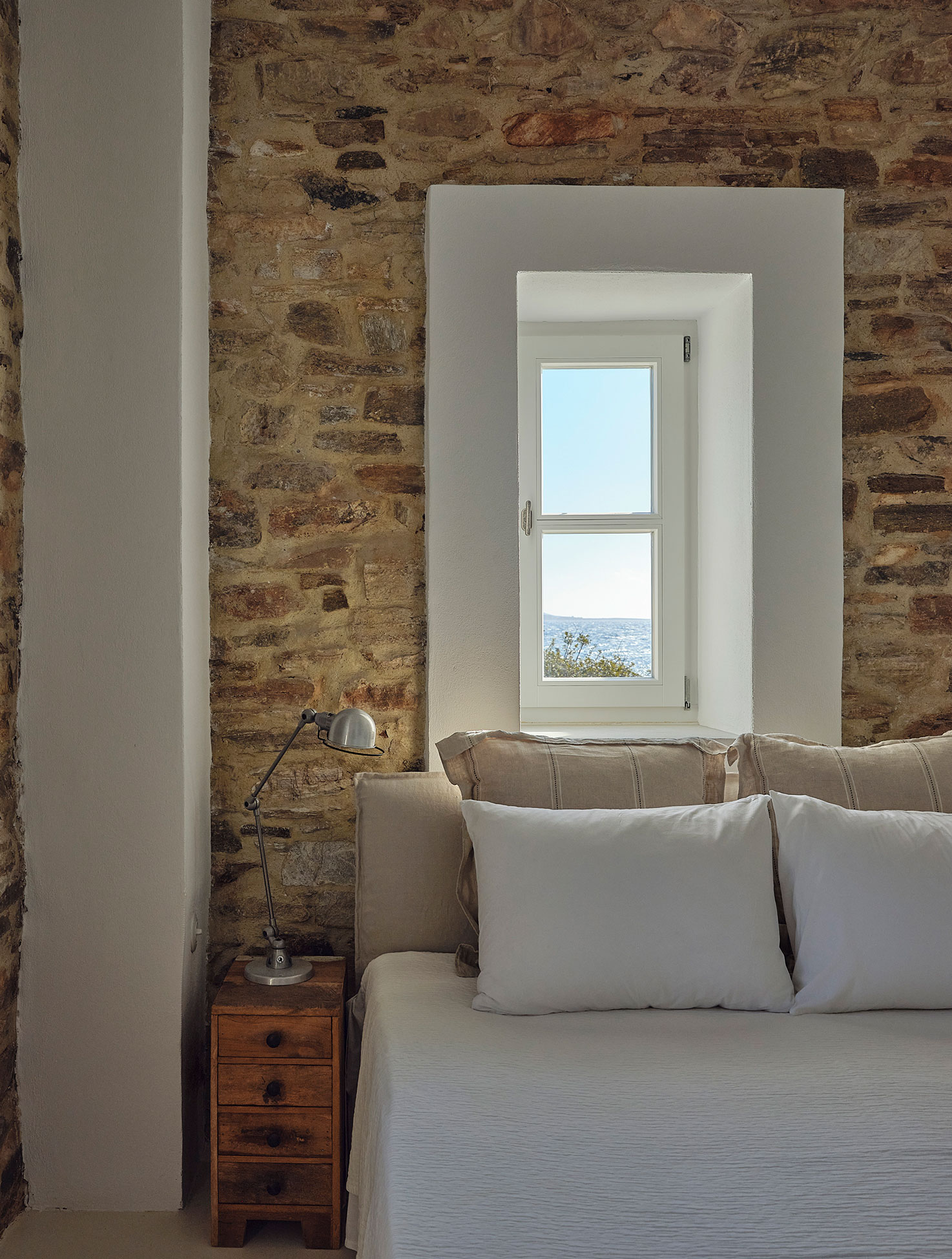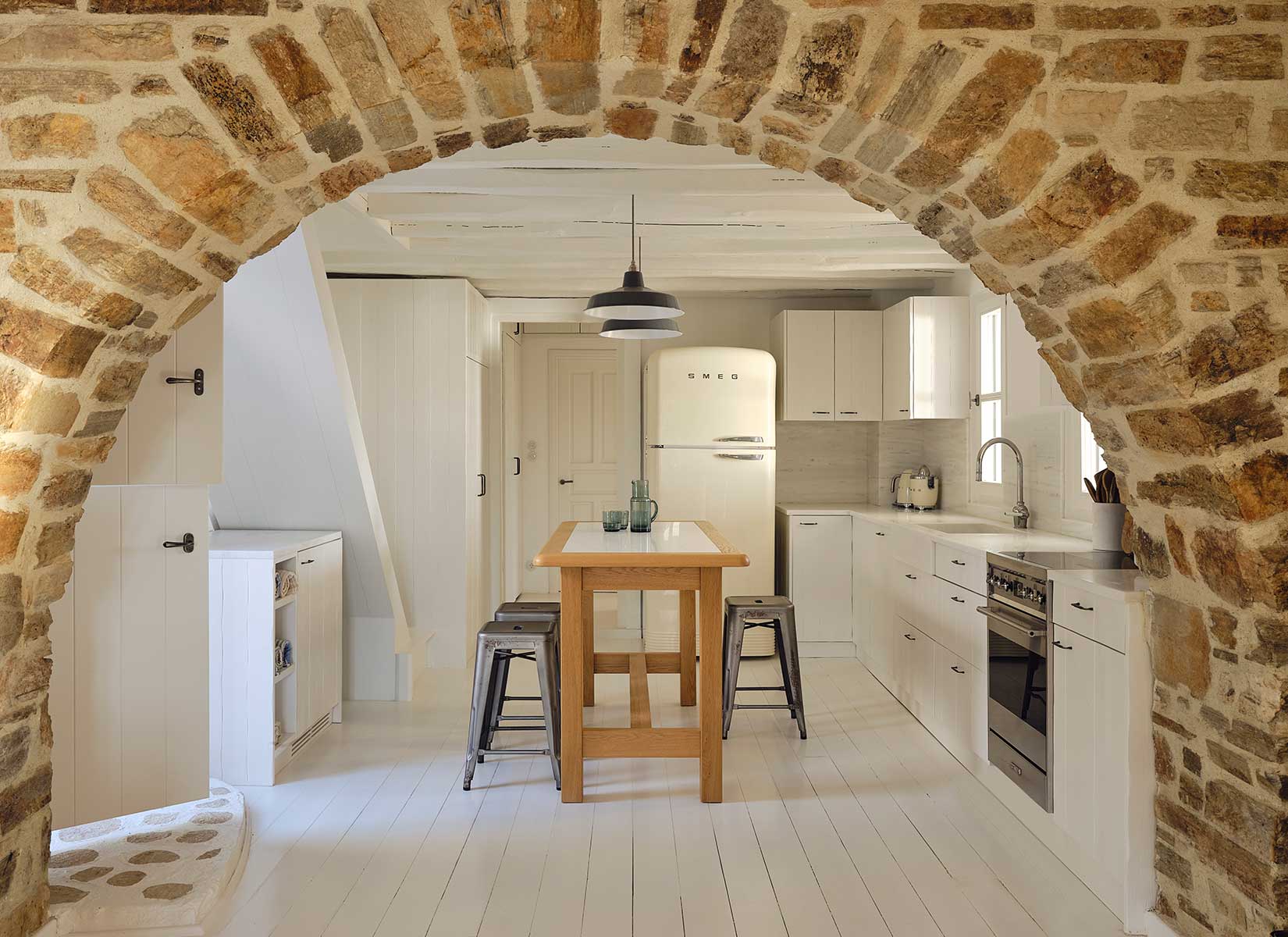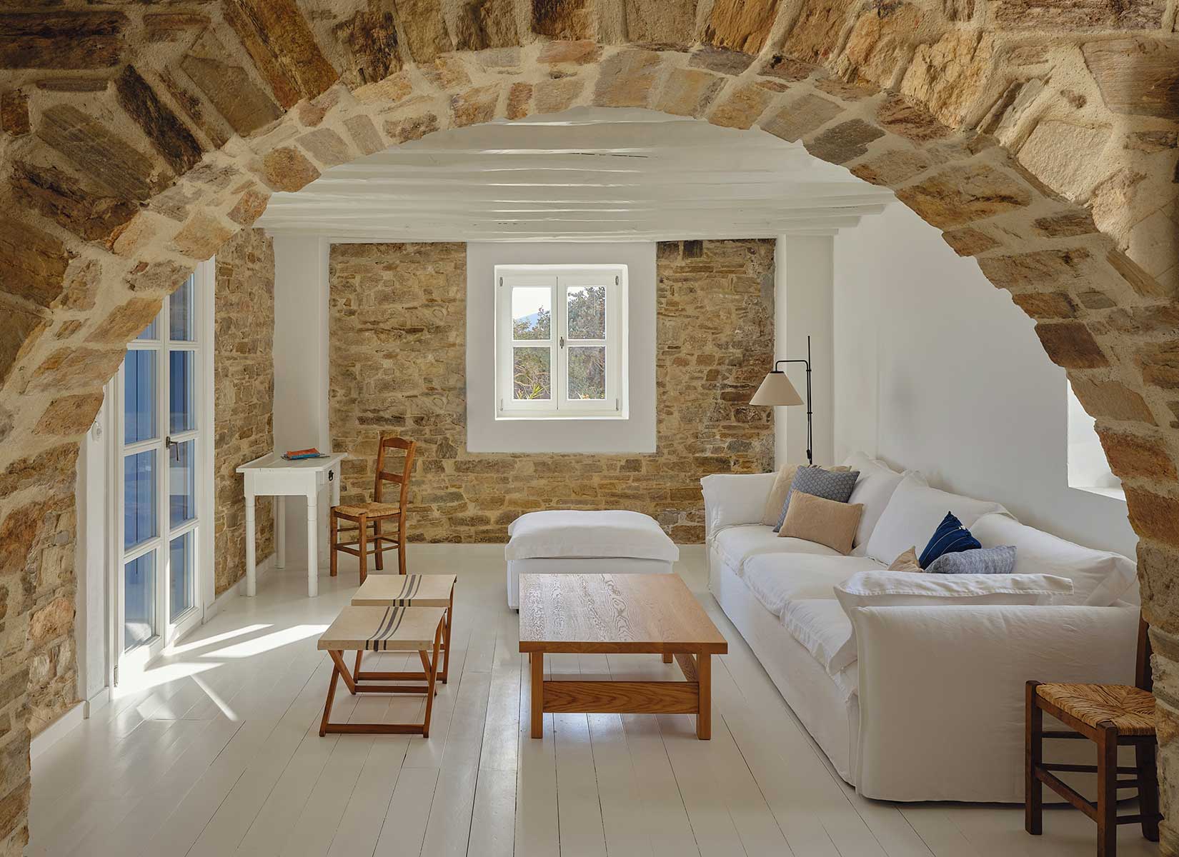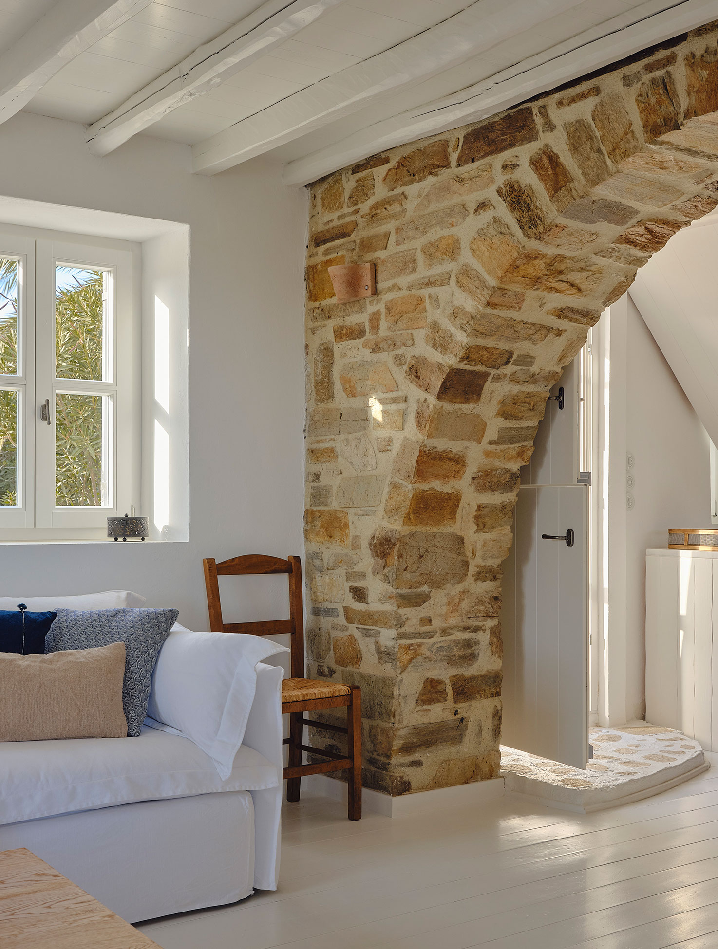For the interiors, we preserved existing materials while introducing white-painted solid oak wood and Naxos marble from the neighboring island. We approached the layout like acupuncture—making small, strategic changes for maximum impact. Our interventions focused on rearranging interior spaces, particularly the bathrooms and kitchen cabinetry, to improve functionality. The combination of natural, local materials with clean lines creates harmony between vernacular and contemporary aesthetics. This thoughtful balance of past and present extends throughout the architectural details and furnishings chosen for the summer residence.