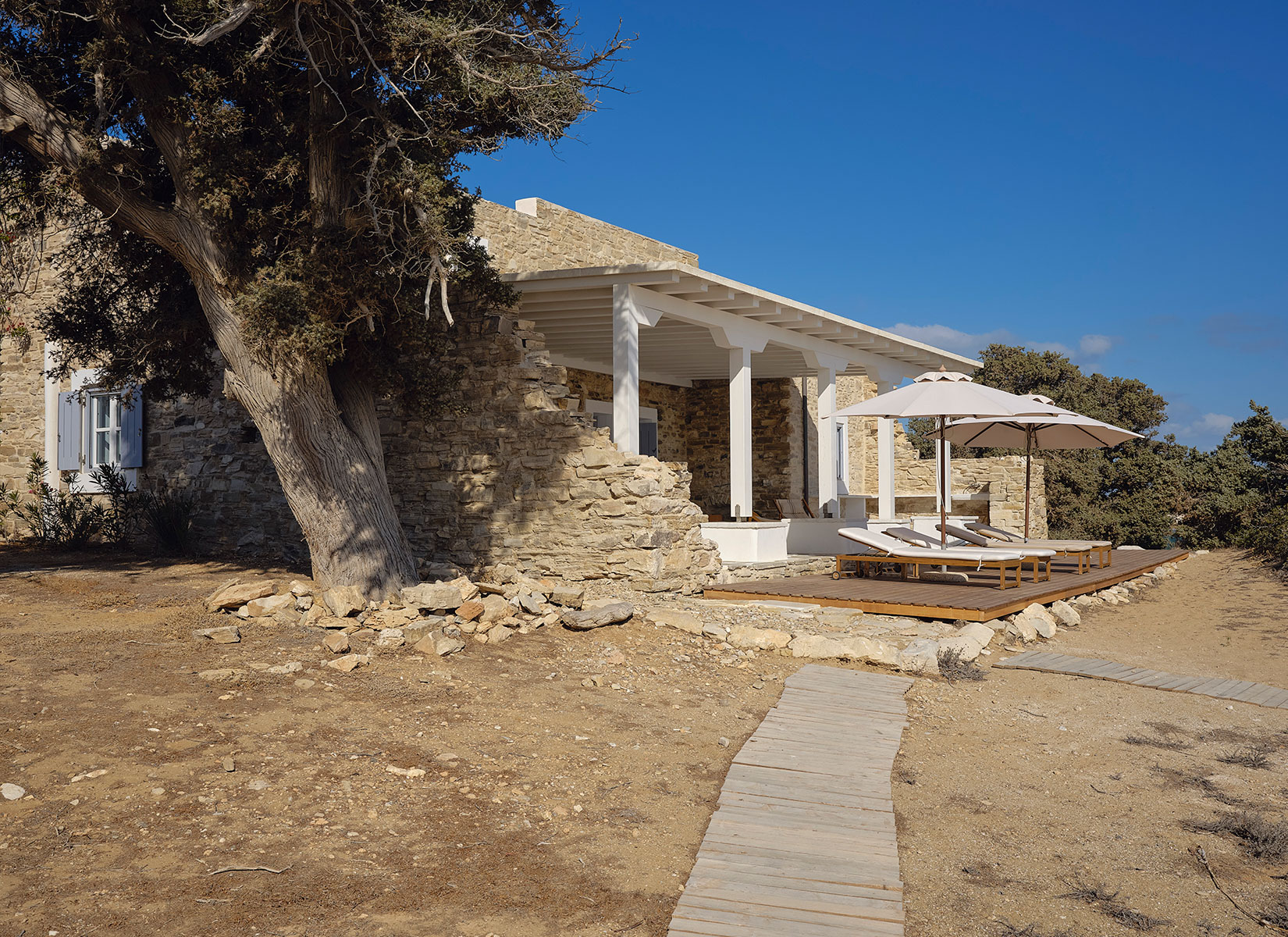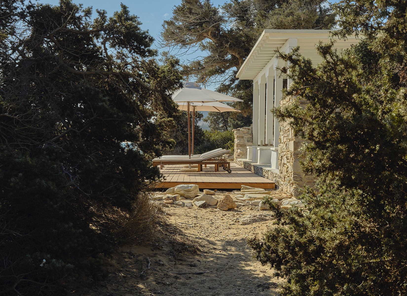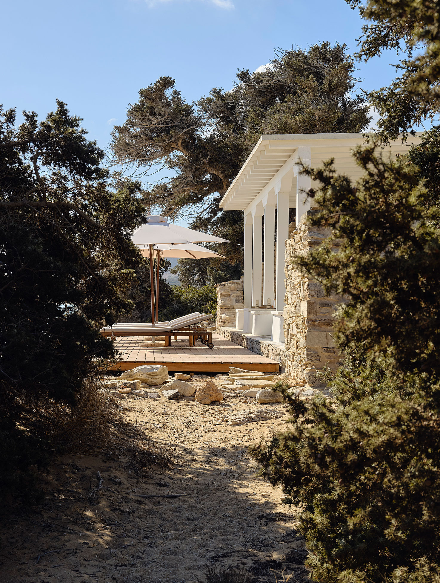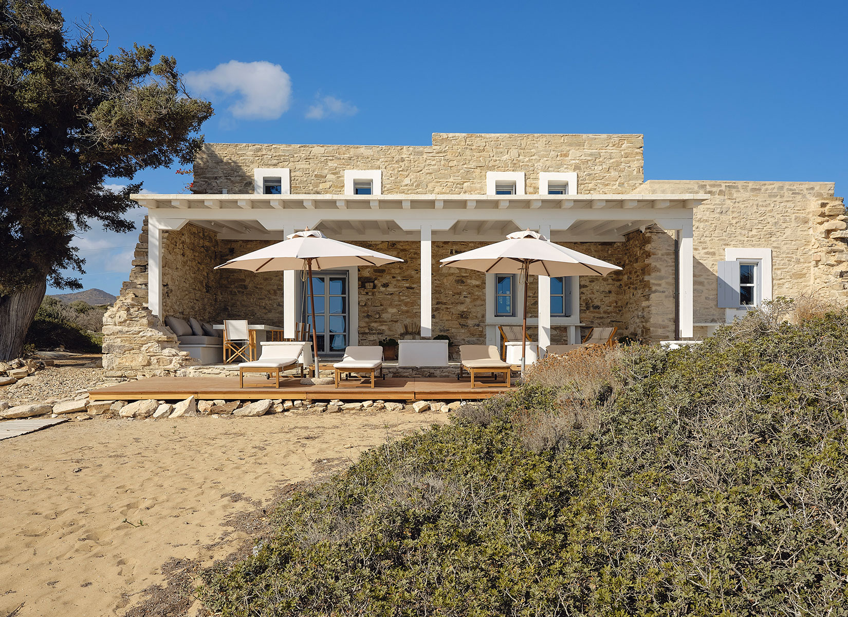 Patitiri, which translates to “winepress” in Greek, is a historic stone building constructed between 1933 and 1936 on the shore of Antiparos, a small island in the Cyclades. People would gather here to practice the traditional wine-making process of grape stomping —stepping barefoot on grapes placed in vats to release their juices and begin fermentation. Ancient traces found in the sea reveal that people have been growing vines in this area since antiquity. Over time, through various changes in ownership, Patitiri has transformed into a beautiful beachfront getaway.