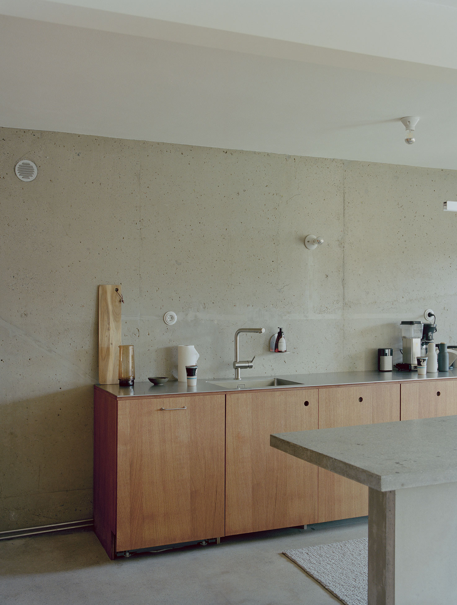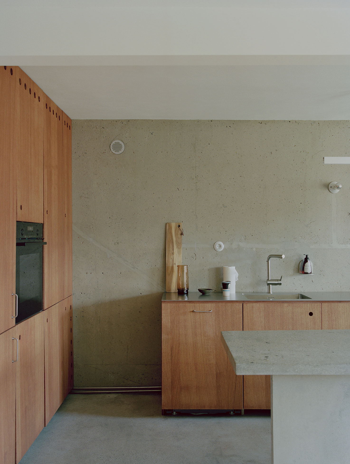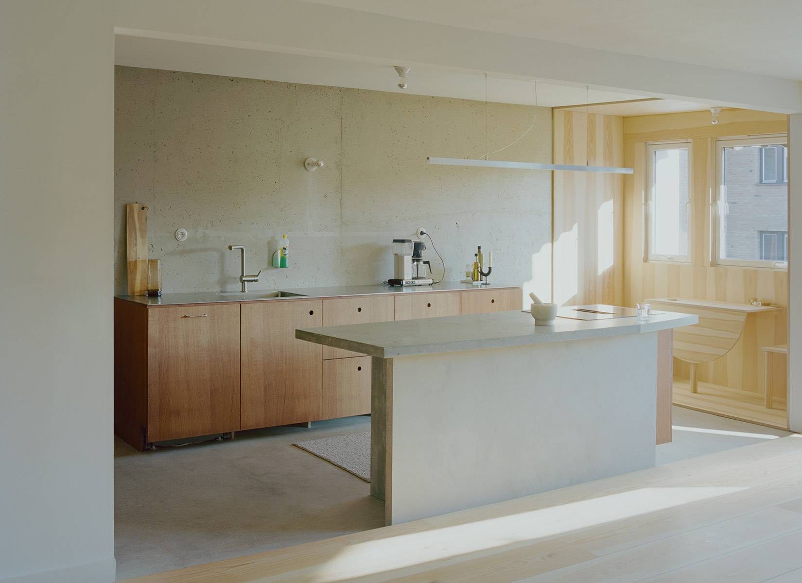 A custom kitchen island cast in concrete with local aggregate mediates the space between kitchen and living room. A few place-built furniture pieces in pine and stained oak are added to create a warm niche in the kitchen, a place to tie your shoes, put your towels etc – constructed in the most direct and simple way possible. The material combination of the house is a composition of natural materials and surfaces, in the materials’ own colors, coming together as a whole, revealing the structural layers of the existing building. The separation of architectonic elements provides the opportunity to change or replace building parts or adapt the structure to a new purpose, while the main structure remains. Together forming an aesthetic of something unfinished or in constant change.