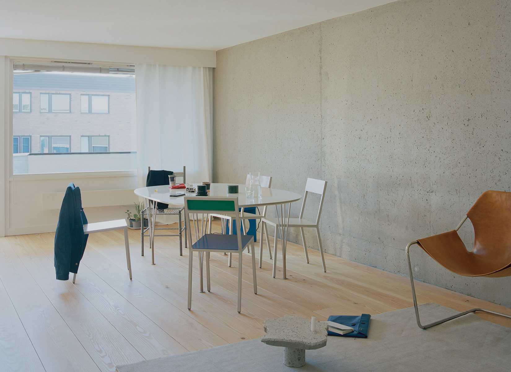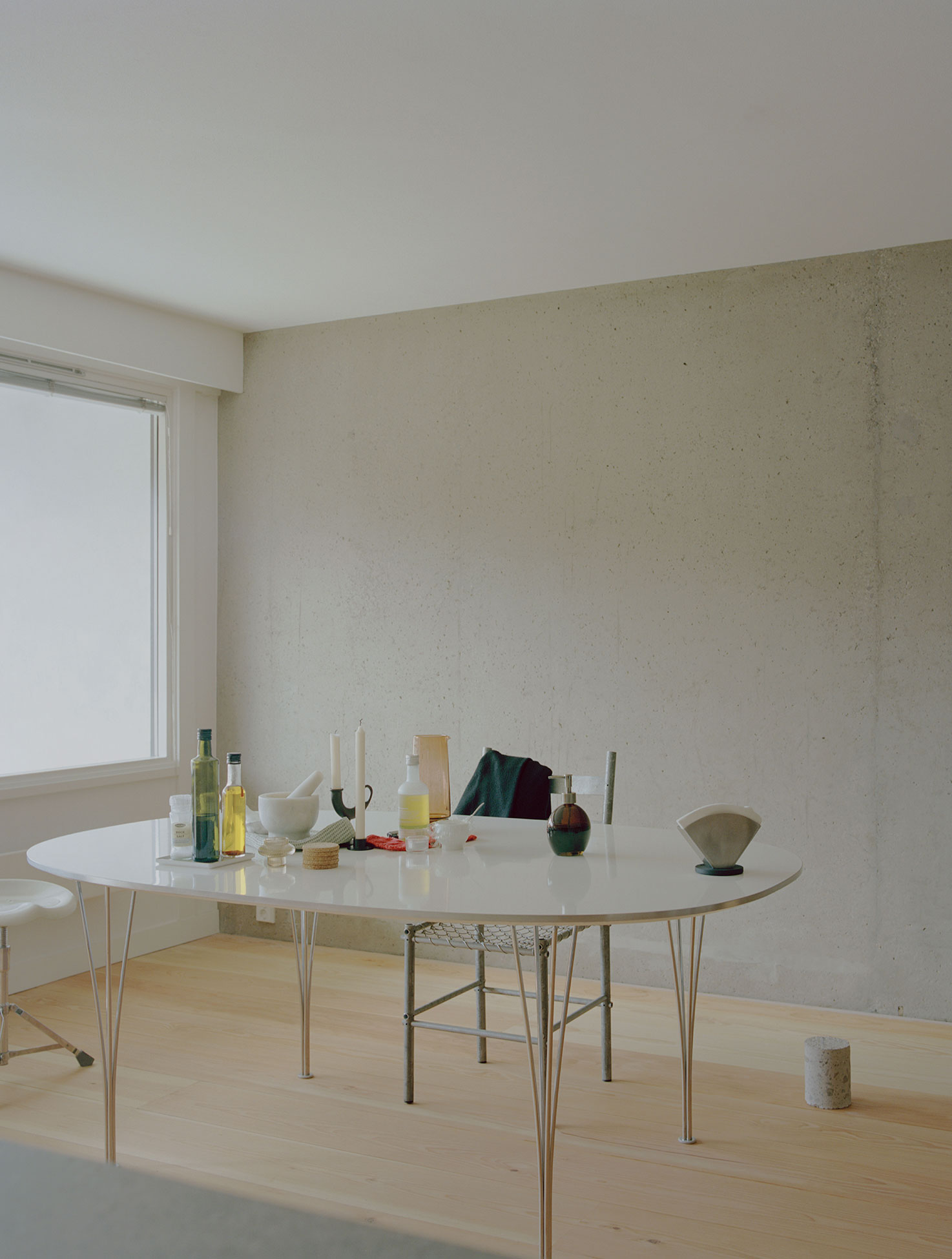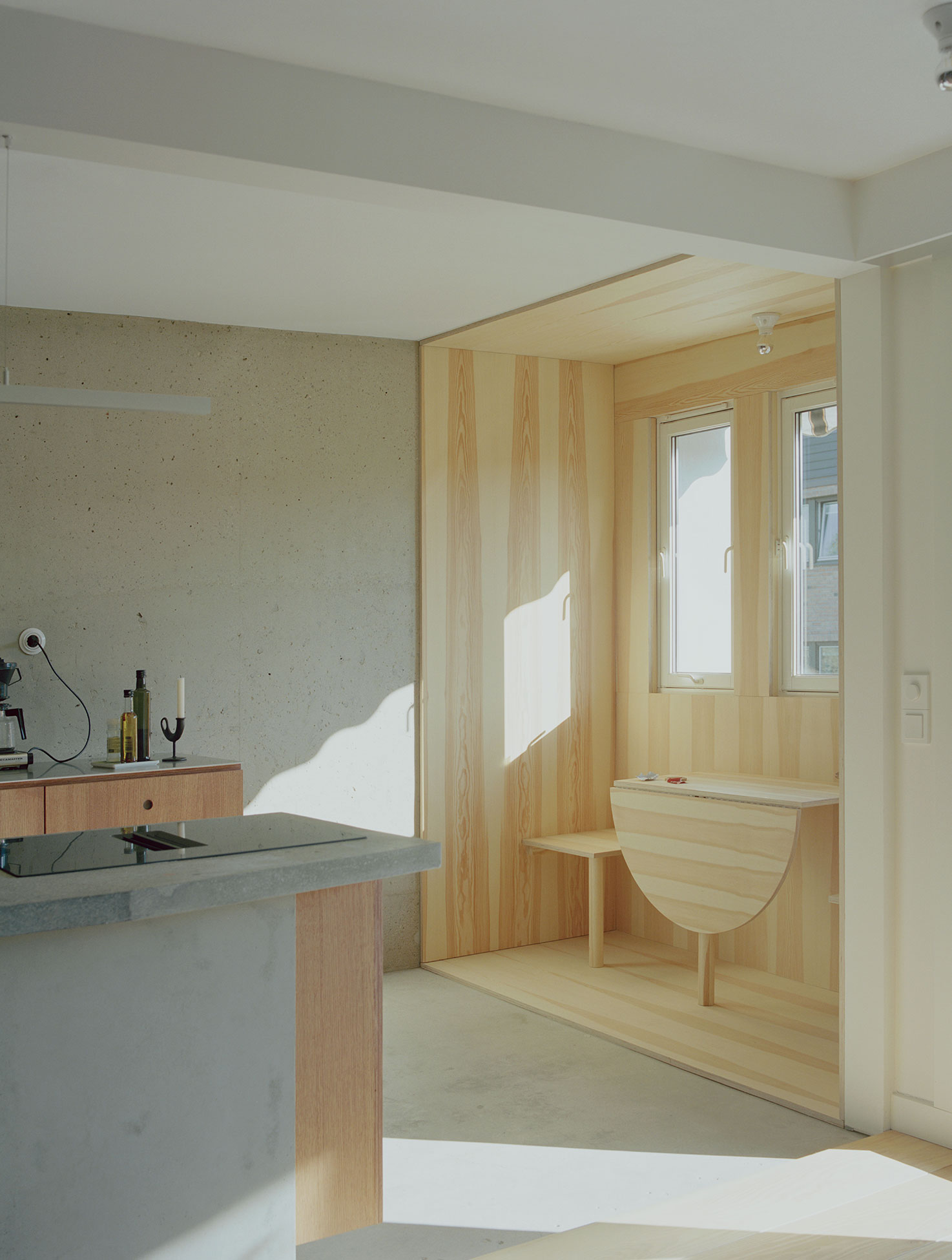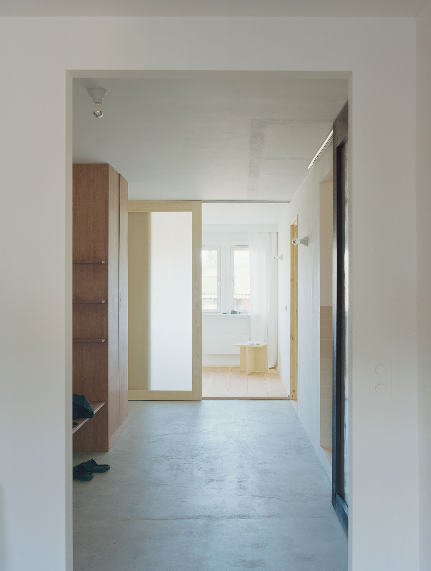 A custom kitchen island cast in concrete with local aggregate mediates the space between kitchen and living room. A few place-built furniture pieces in pine and stained oak are added to create a warm niche in the kitchen, a place to tie your shoes, put your towels etc – constructed in the most direct and simple way possible. The material combination of the house is a composition of natural materials and surfaces, in the materials’ own colors, coming together as a whole, revealing the structural layers of the existing building. The separation of architectonic elements provides the opportunity to change or replace building parts or adapt the structure to a new purpose, while the main structure remains. Together forming an aesthetic of something unfinished or in constant change.