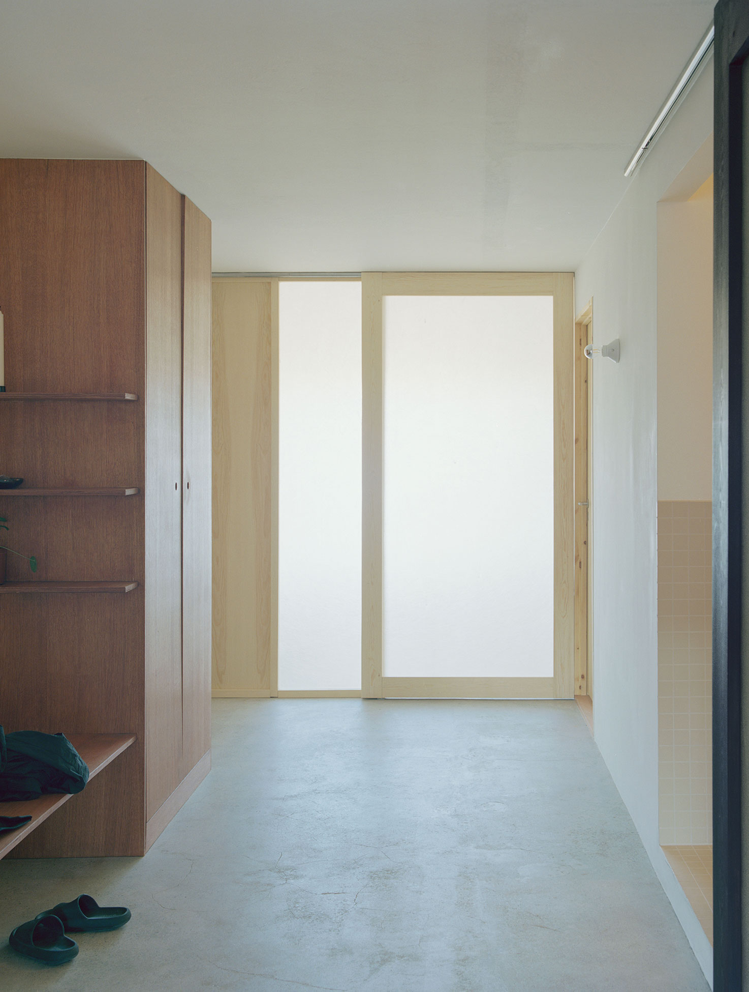 The apartment building is constructed in concrete with load bearing slabs and shear walls. The plan is essentially an open plan and the apartment is very narrow, with the potential quality of being connected to both sides of the building. The new plan enhances the length and sight lines through the house with a generous hall as a connecting space. Light wooden frames with sheets of fibreglass permit daylight to filter into the deep spaces of the plan.